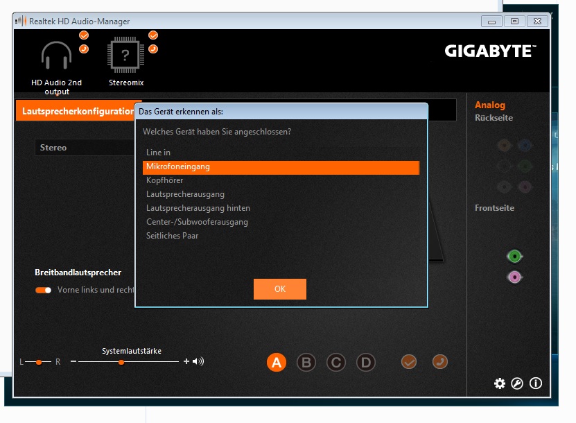 Auch die Front-Buchse müsste nach menschlichem Ermessen angeschlossen sein und funktionieren. Das Betriebssystem bzw. die entsprechende Gigabyte-Software "merkt", wenn man den Stecker einsteckt, und ruft die entsprechende App auf (die ersten beiden Screenshots).