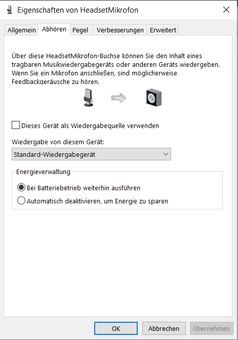 Ich habe das Headset bereits auf verschiedenen Geräten getestet, bei denen ich nicht das Problem habe. Dann habe ich andere Mikrofone an meinem Laptop getestet. Ein anderes Headset klingt auch abgehackt - billige In-Ear Kopfhörer nicht.