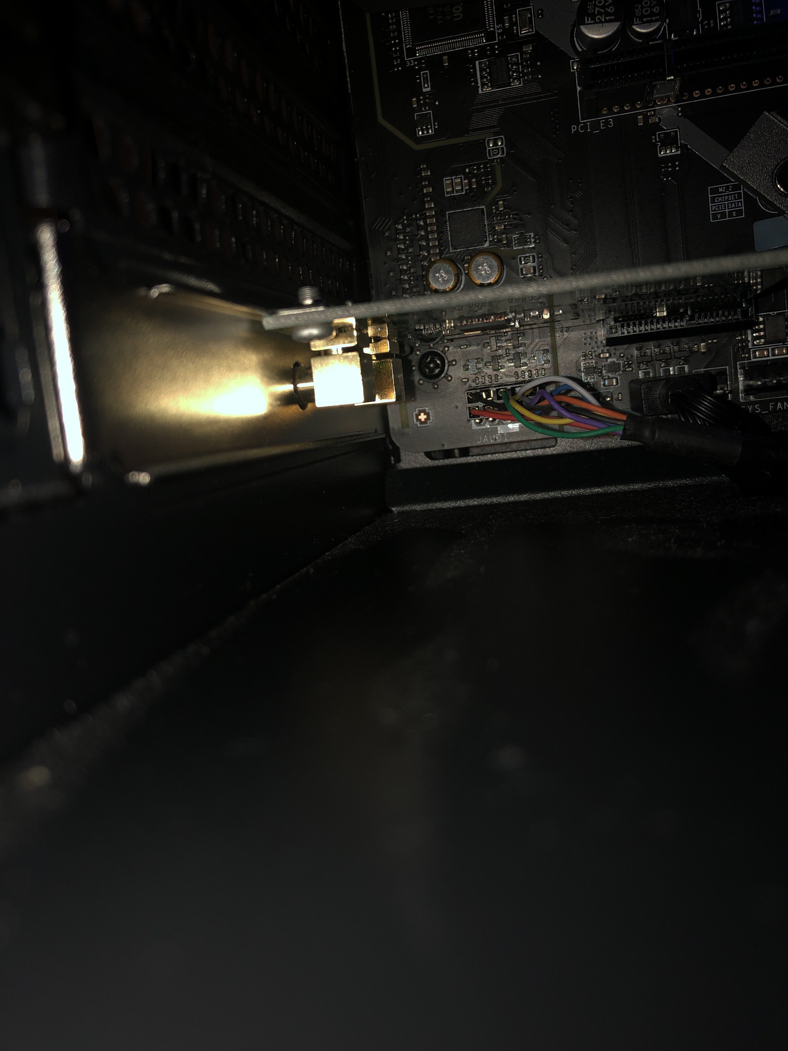 Hab im Handbuch geschaut und dafür ist wohl der Stecker JAUD1 verantwortlich. Der Stecker sitzt da aber irgendwie nur halb drauf, sodass die unteren Pins frei sind. Liegt das vielleicht daran?