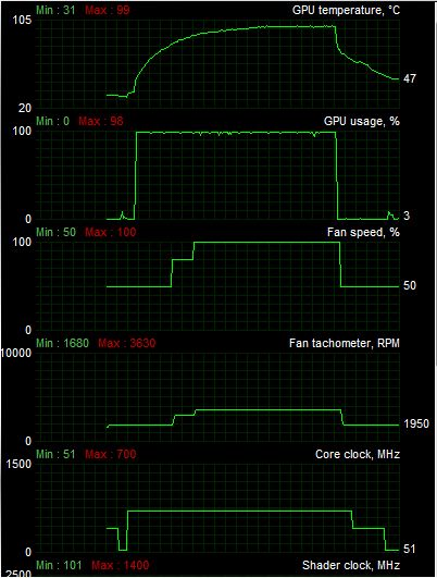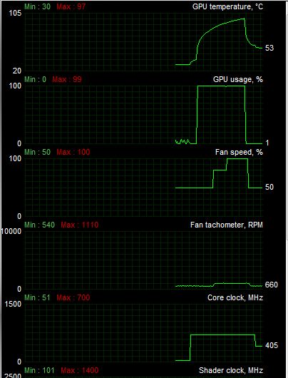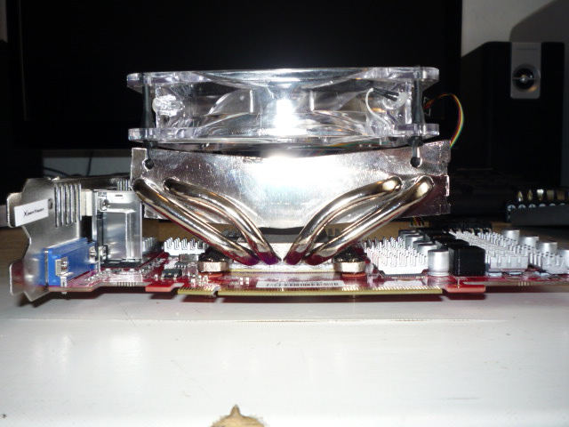 ich hatte mir von privat oben genannten Grafikkartenkühler gekauft, um die extreme Lautstärke des Standard-Kühlers meiner Palit Sonic Grafikkarte zu reduzieren. Die RAM-Bausteine sind natürlich auch mit den beiliegenden Passiv-Kühlern bestückt. Gleiches gilt für die hitzigen Spannungswandler. Trotzdem schießt die Temperatur im FurMark innerhalb von 32 sec. auf 90°C hoch, wobei dann auch 80% Lüftergeschwindigkeit und 1110 U/min anliegen. Ausgelesen wurden diese Werte mit dem MSI Afterburner der Version 2.0.. Die Karte ist nicht übertaktet und wurde auch noch nicht übertaktet. Als Wärmeleitpaste kommt eine hauchdünne Schicht Arctic Cooling MX-2 zum Einsatz.