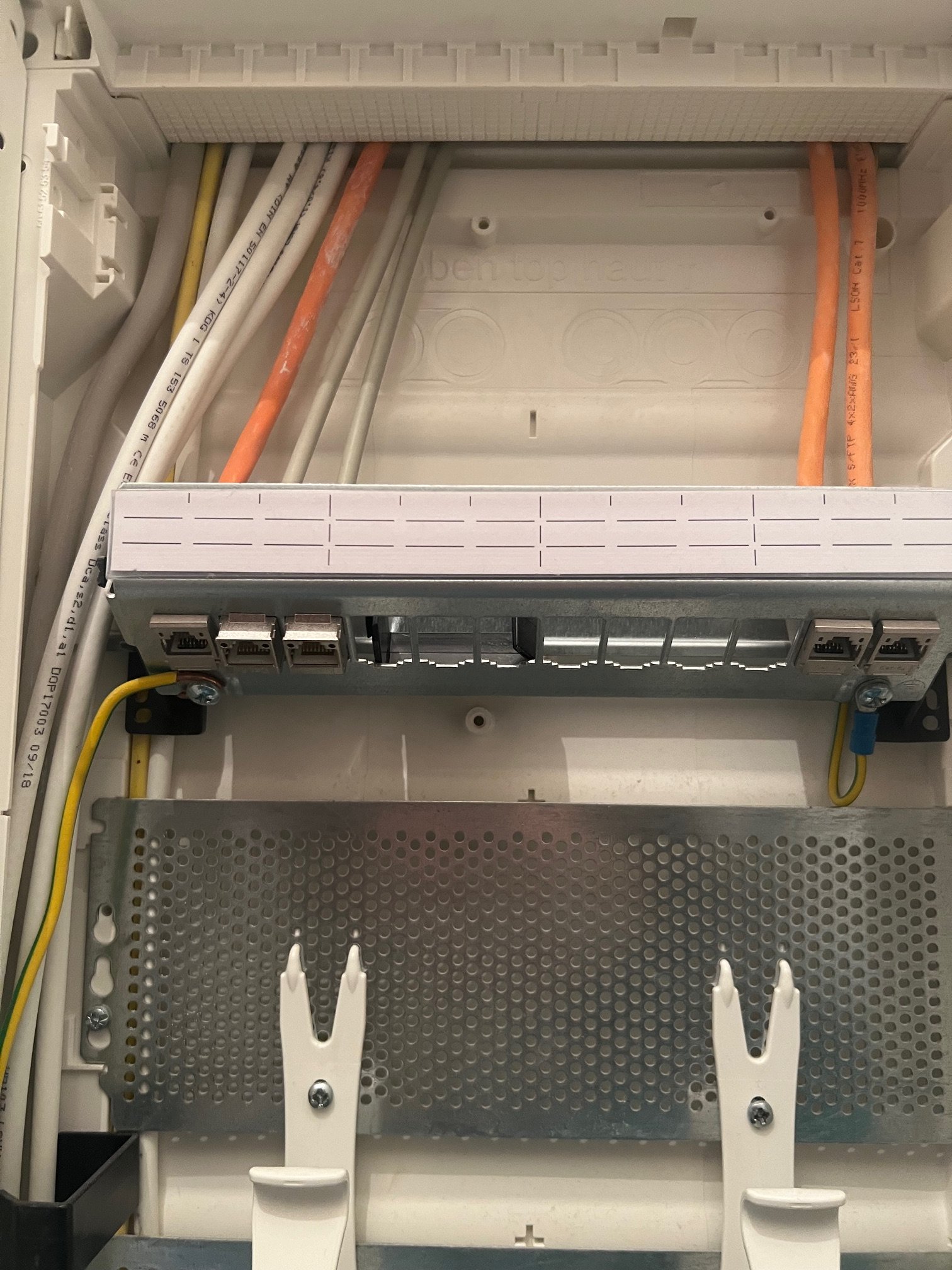 Im Idealfall prüfst du jetzt noch genau nach welcher Port am Patchfeld (das Ding mit den 3 orangenen und 2 grauen Kabel) wohin führt und beschriftest den Port entsprechend. Mir scheint du hast einfach auf gut Glück irgendwo Kabel reingesteckt und erst ging es nicht und jetzt schon. Das sind denkbar schlechte Voraussetzungen für künftige Kabelarbeiten.
