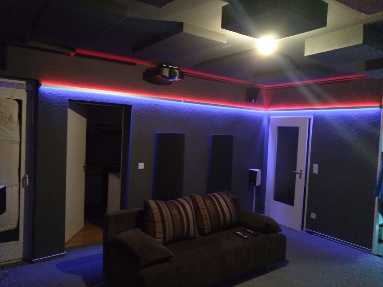 Schaue ich mir die Bilder deines Kinos an, wird mir aber gleich einiges klar: Du hast im Prinzip den Kardinalfehler gemacht, indem du Mitten- und Höhenabsorber en masse im Raum verteilt hast, vermutlich Pi mal Daumen, aber den Bass völlig vernachlässigst. Die Dämpfung wird dadurch noch unausgewogener, als sie naturgemäß schon ist. Merke: Wenn du einen Raum akustisch behandelst, beginnst du immer mit dem BASSBEREICH. Dieser ist am anspruchsvollsten, erfordert den meisten Platz und größten Aufwand.