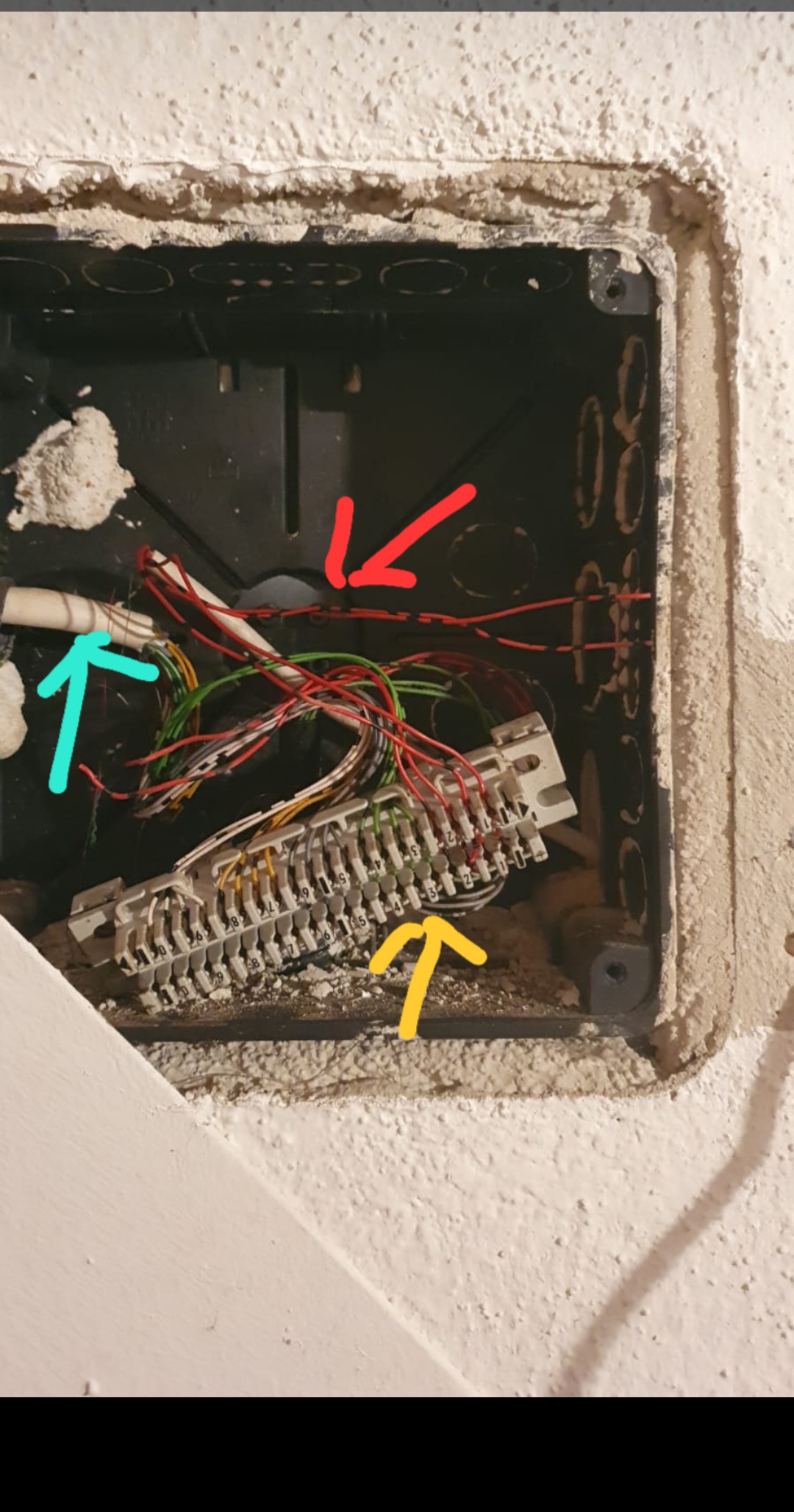 Zu meinen Fragen. Wir schließen ich den Router im Keller an ? Bild anbei. Geld kommt von unten und sind in 4x4 Farben aufgelegt. Ich denke das muss der hausanschluss vom Provider sein. Blau sollten die tel Dosen inhouse sein. Ebenfalls 4x4 angelegt (wobei 1x4 kein "Gegenstück" haben). Der rote Pfeil ist die "dsl leitung?" Und hat 2 der roten Drähte von möglichen hausanschluss gegenüber und führt in den Dachboden.