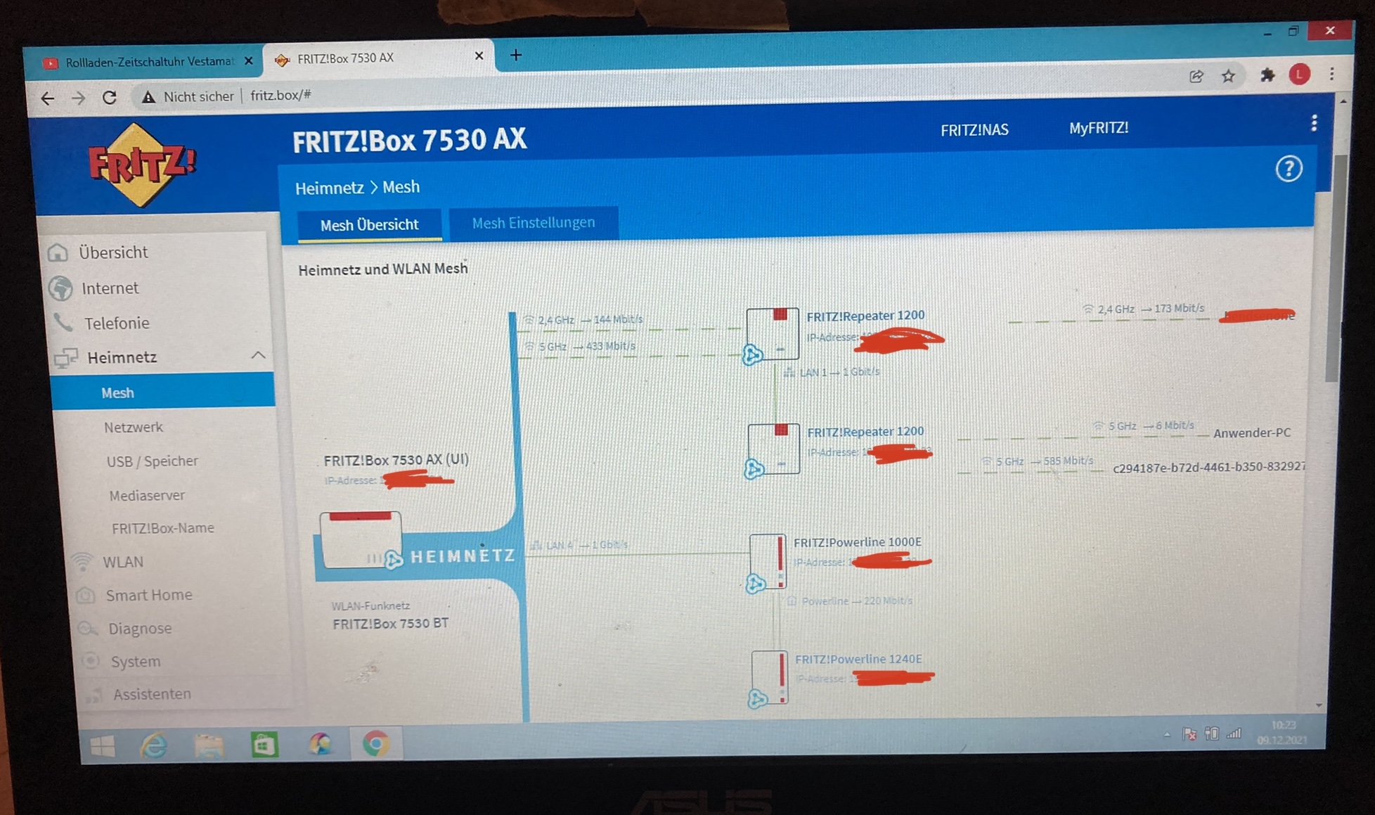 Parallel habe ich festgestellt, dass der Raum im Erdgeschoss direkt über der Fritzbox noch ganz guten Empfang (bis zu 180 Mbps) hat und habe dort einen 1200er Repeater aufgestellt. Dieser reicht aber leider auch nicht bis ins Wohnzimmer, weshalb ich am Repeater via LAN-Kabel einen zweiten 1200er Repater anschließen und diesen im Wohnzimmer positionieren wollte. Auch das führte leider nicht zum gewünschten Erfolg, denn laut Fing-App kam fast nichts an.