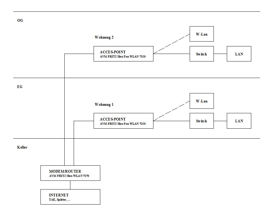 Ich möchte das DSL-Modem im Keller haben und jede Wohnung jeweils per LAN mit einer Wlan-Fritzbox ausstatten. Die Netzwerke sollen voneinander getrennt sein. So das mein Nachbar meine Geräte nicht sehen Kann.