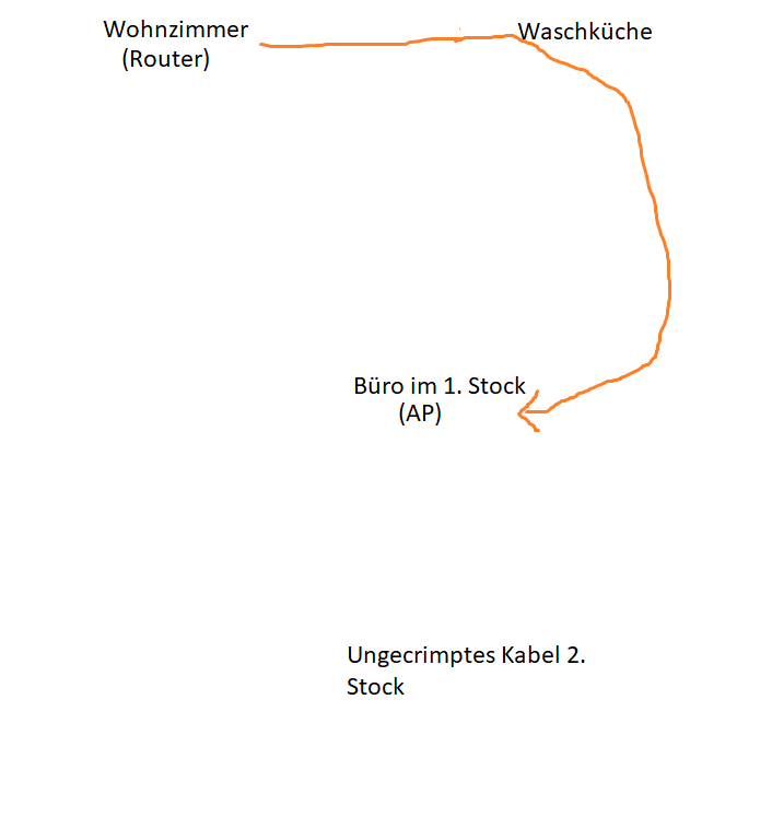 - Im 2. Stock ist ein bisher ungecripmtes Kabel vorhanden hinter einer Blende. Hier soll eine weitere Ethernet Buchse hin (ggfs. 2. WLan AP aber hoffentlich nicht notwendig)