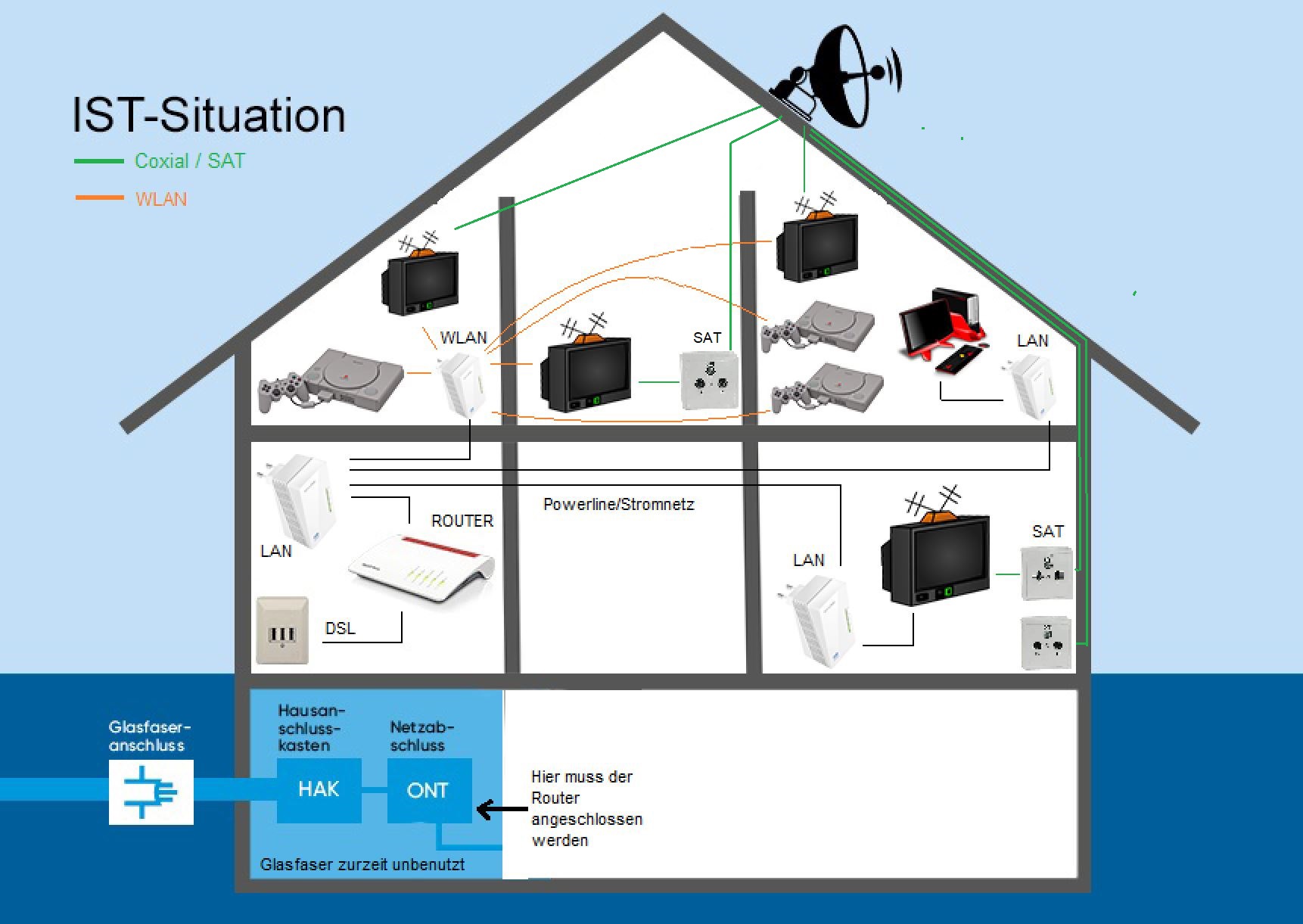 Im Keller ist der "HÜP" wo Glasfaser von außen reinkommt und der "NT" an dem ein RJ45 Anschluss ist, welcher wohl mit dem Router verbunden werden soll. Als Router haben wir die Fritzbox 7590. Der Router war bis bis jetzt im Raum genau oben drüber (im "Büro") und hat von dort aus die Endgeräte mit vielen TP Link Powerline Adaptern/Repeatern über das Stromnetz versorgt.