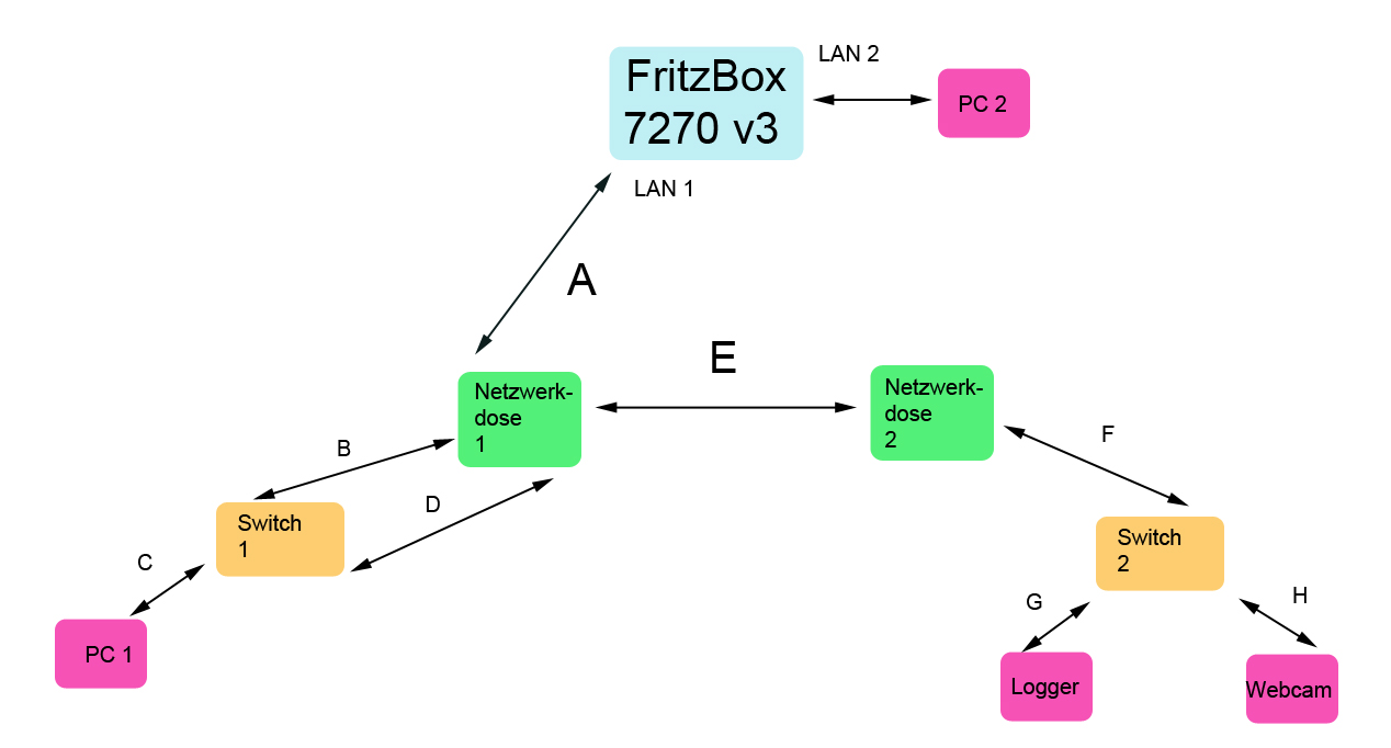- von der Netzwerkdose 1 geht eine Netzwerkkabel Leitung E (ca. 25 m und in der Wand verlegt) zur Netzwerkdose 2