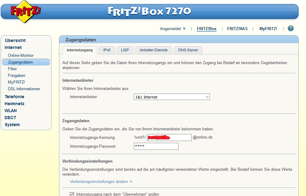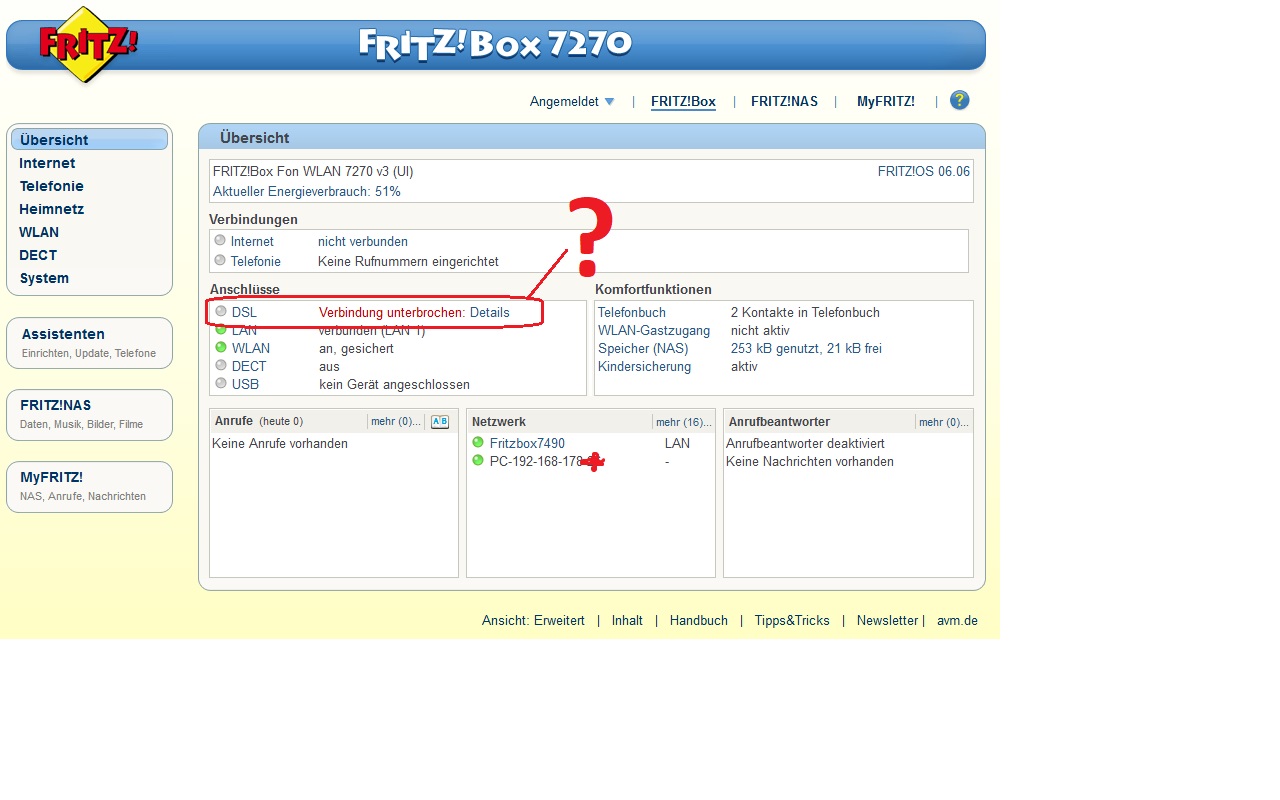 Wie man sieht, führt die DSL-Leitung in meine Fritzbox 7490
