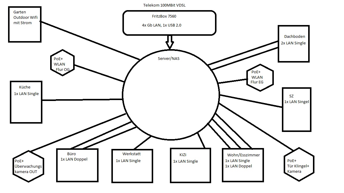 Ausgangspunkt ist der Telekomanschluss im Keller. Dort soll dann auch das NAS in einem Serverschrank untergebracht werden. Die Verteilung in die Räume anbei auf dem Netzwerkplan.