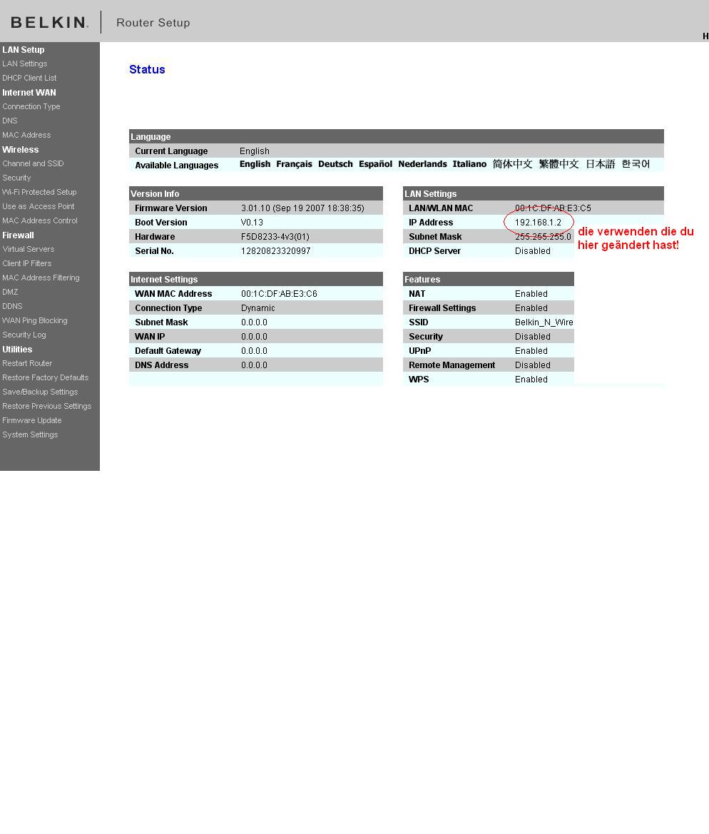 Das was auf dem Screenshot zu sehen ist, war die IP welche ich vorher geändert hatte. Damals war der Router auch noch am WAN Port angeschlossen, so konnte ich auch den Belkin Router "installieren/konfigurieren" außerdem hatte ich mit diesen Einstellungen keinen Internetzugang. Aber jetzt wo er am LAN Port hängt finde ich dieses Menüs wie auf dem Screenshot abgebildet nicht mehr wieder.