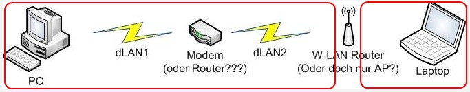 Standrechner -> dLan -> Modem -> dLan -> WLan Router -> Laptop