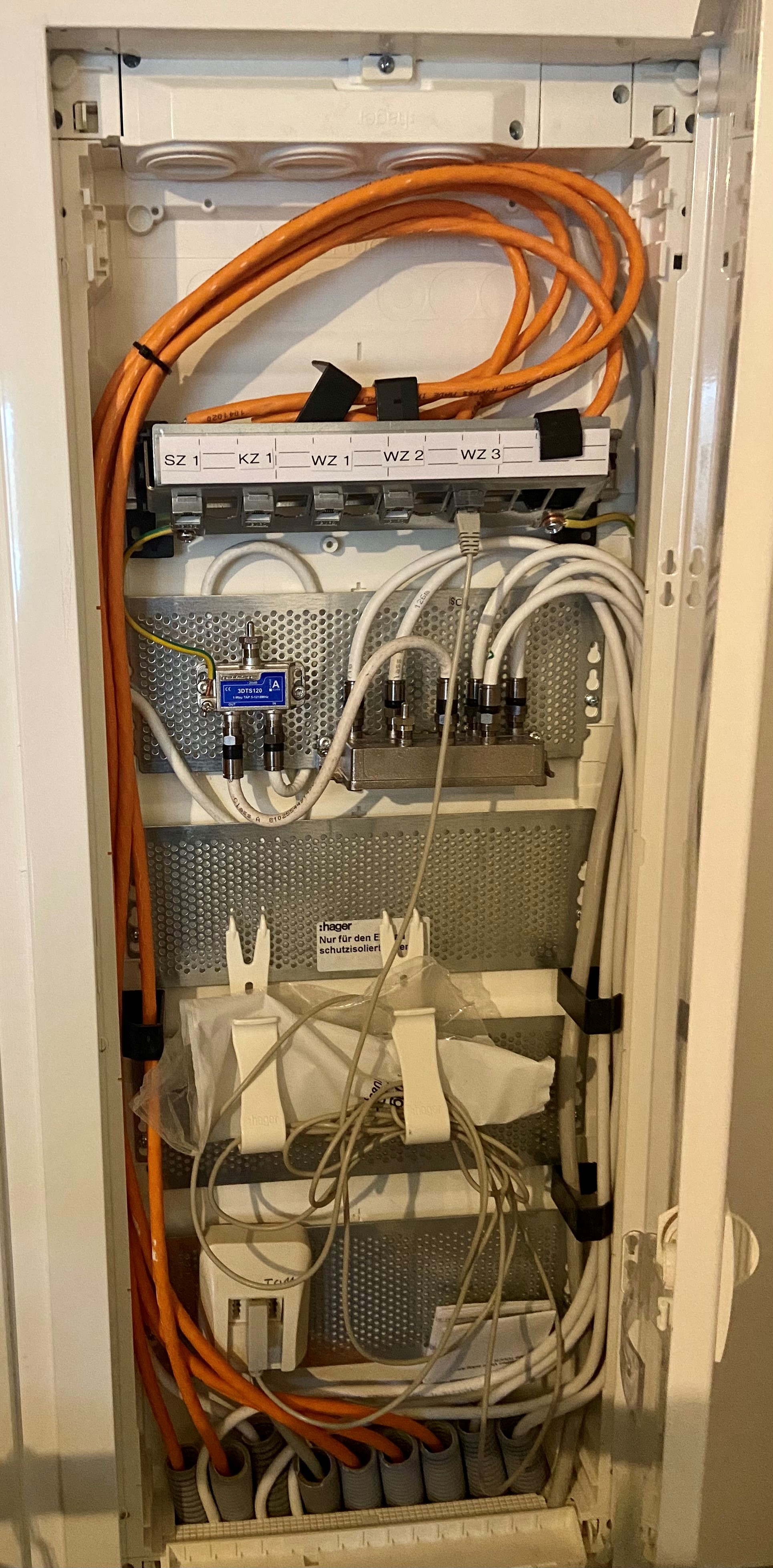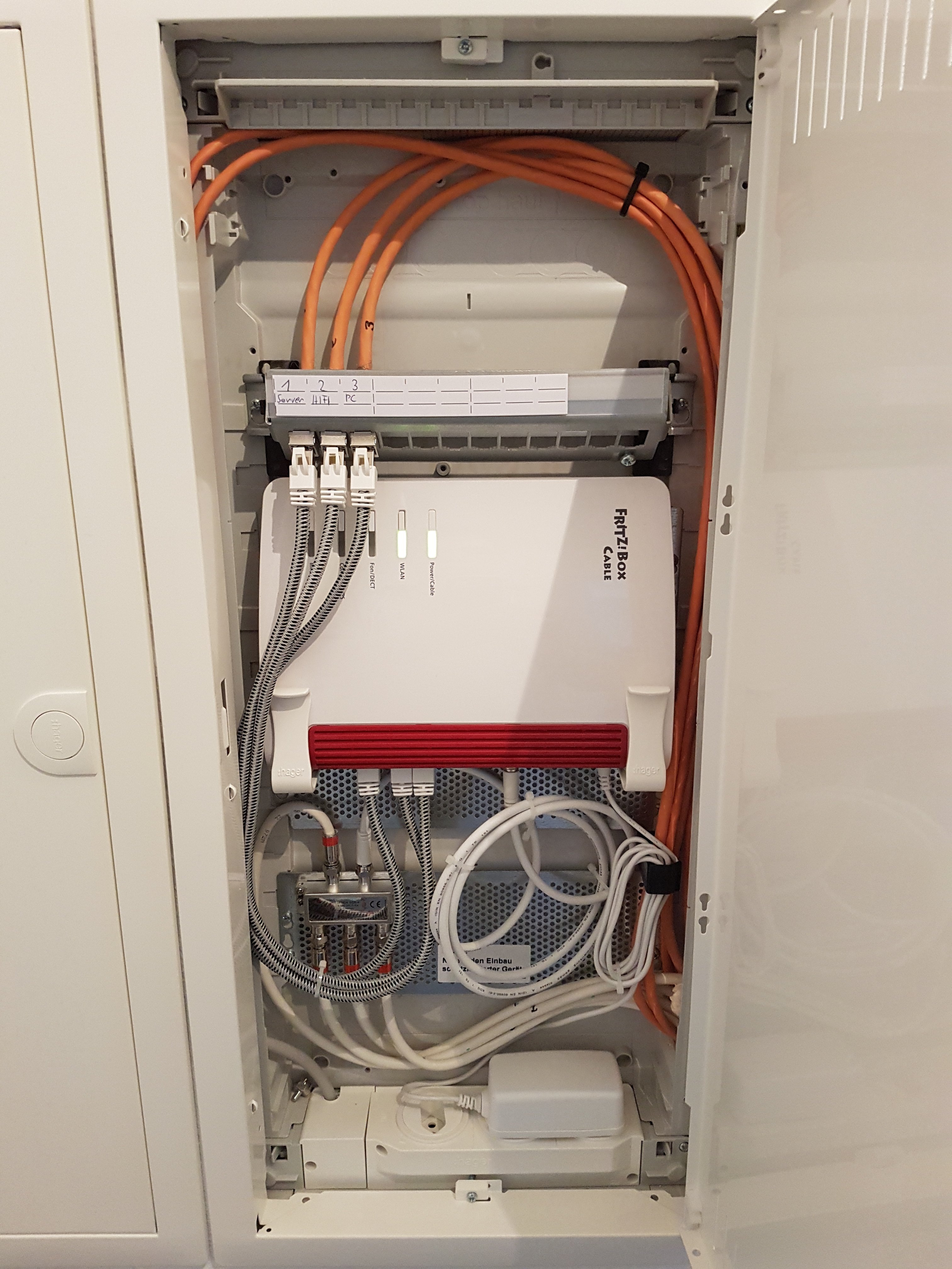 Das Eingangssignal des Telefonanschlusses sowie die Vernetzung der LAN-Dosen in den einzelnen Räumen befinden sich in einem schmalen Metallkasten hinter einem Schrank im Flur. Da das für einen WLAN-Router natürlich nicht der besten Standort ist, wurde das Telefonsignal ins Wohnzimmer umgeleitet, wo eine Fritz!Box 7412 steht, die von dort das WLAN-Signal sendet.