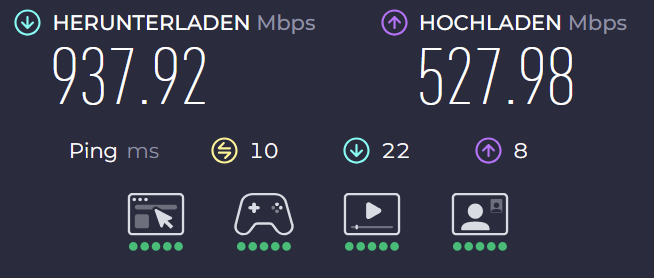 Ich habe derzeit Glasfaser mit 1000/500 Mbps (auch wenn ich nach Ende des 1. Vertragsjahres auf 300/150 Mbps downgraden werden. Hardwareseitig bin ich mit eine OPNsense als Firewall, einem Aruba 1930S und mehreren Unifi AC Pro (kein Upgrade auf Wifi 6E/7 derzeit geplant) ausgerüstet. Zwei weitere kleine 8-Port-Switches verbinden quasi alle stationären Endgeräte, sofern die einen LAN-Port haben. WLAN wird eigentlich nur von unseren Smartphones, Notebooks und ein paar Smarthome Clients genutzt.