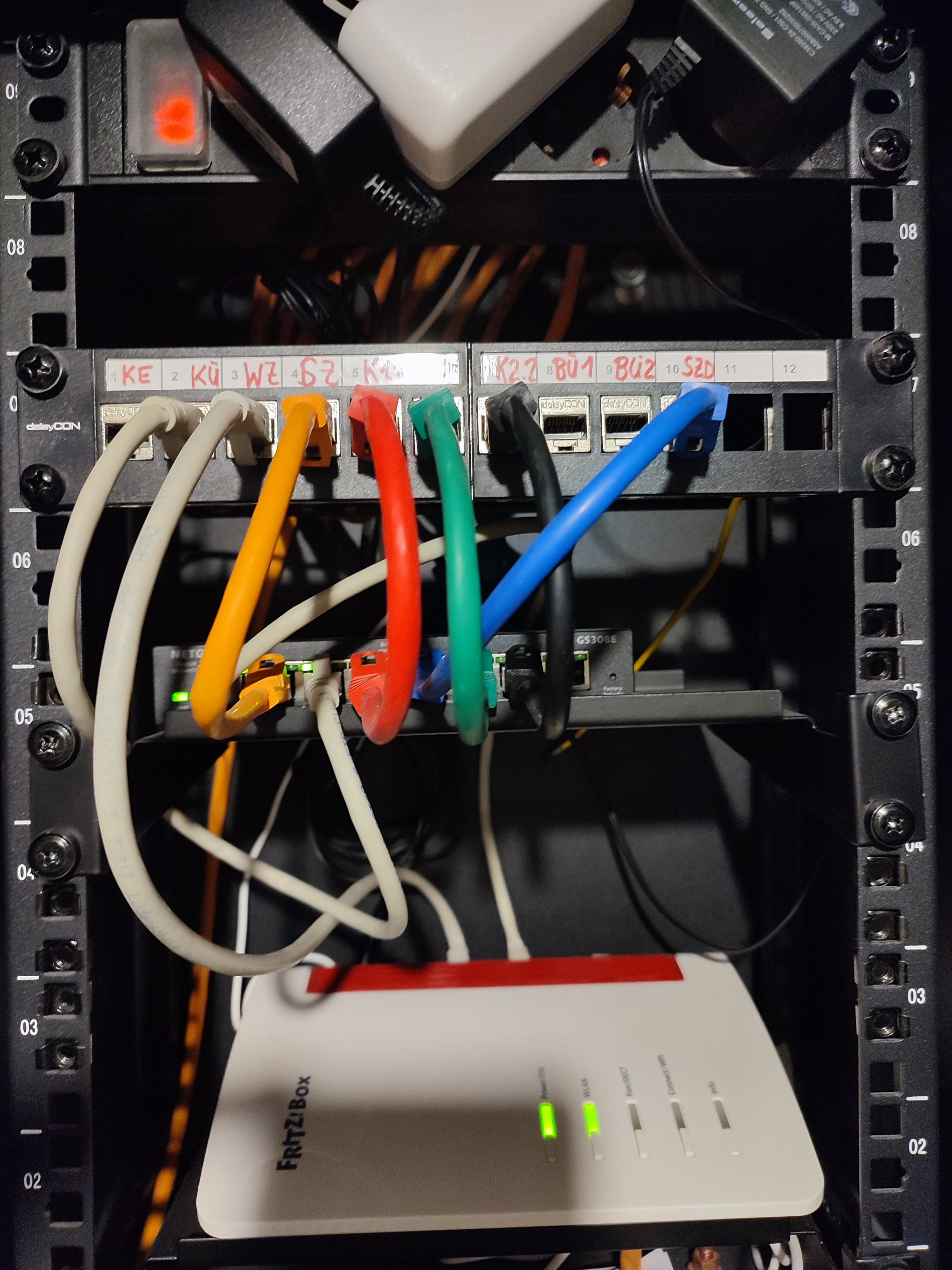 EG: Netzwerkschrank mit AVM Firtzbox 7530, Netgear GS308E von da aus Kabel in alle Wohnräume