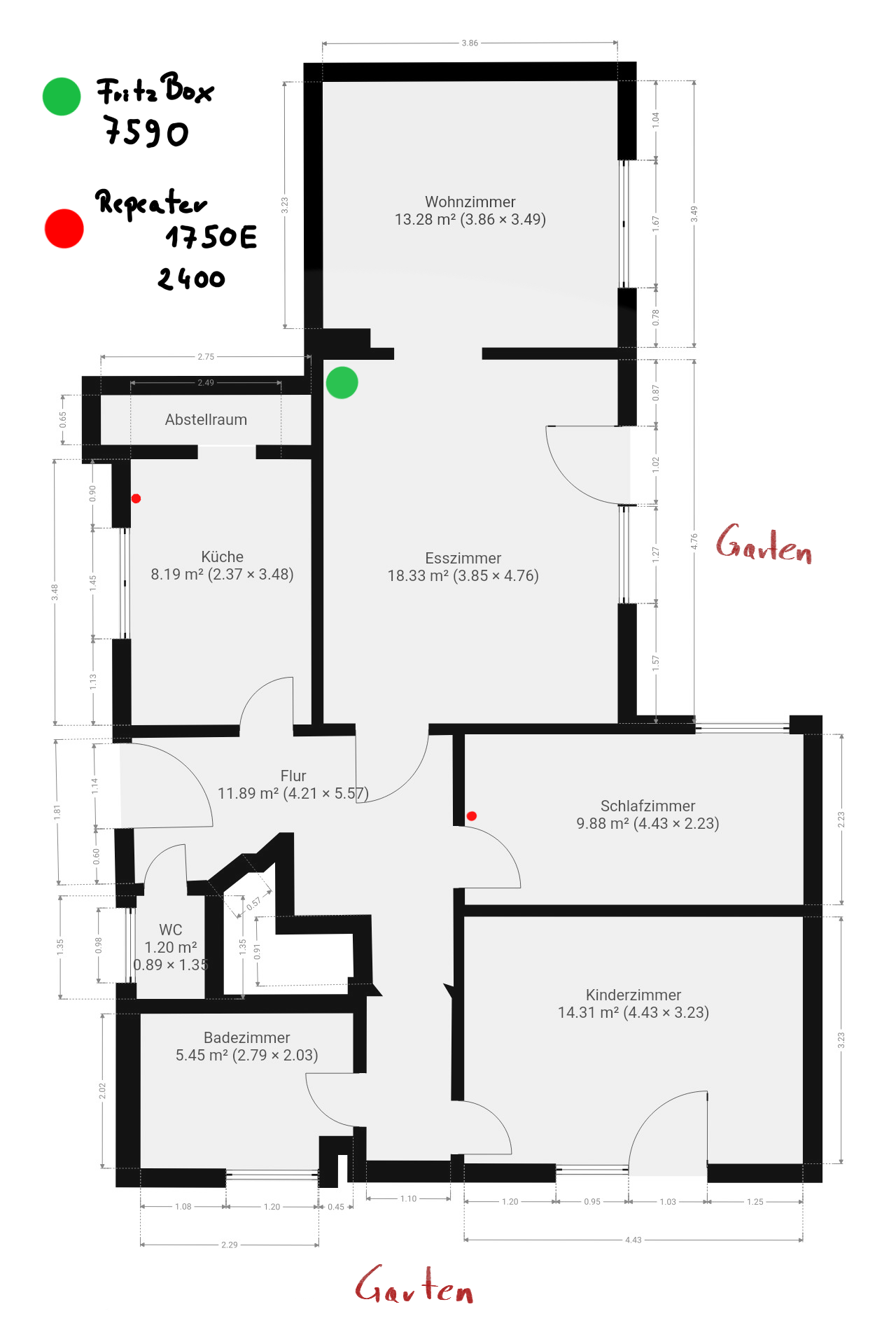 Damit ihr euch ein Bild meiner Wohnung und Wände machen könnt habe ich ein Grundriss erstellt, wo die Größe der Räume und co eingezeichnet ist. Unteranderem habe ich auch die FritzBox und Repeater eingezeichnet.