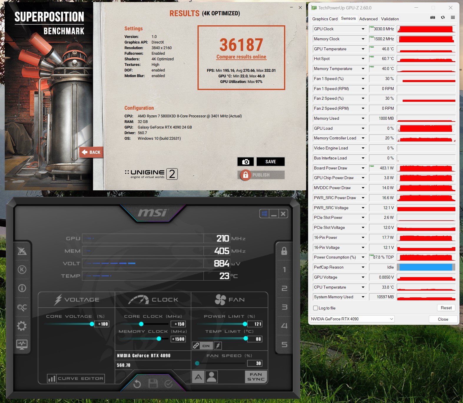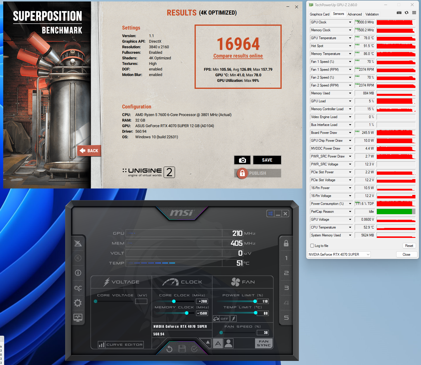 Die Grafikkarte macht mir aber etwas Sorgen. Bei drei Betriebspunkten mit 90, 100 und 110% TDP bekomme ich im im Superposition 4k Benchmark diese Werte. Da reden wir dann über 200, 225 und 245 Watt.