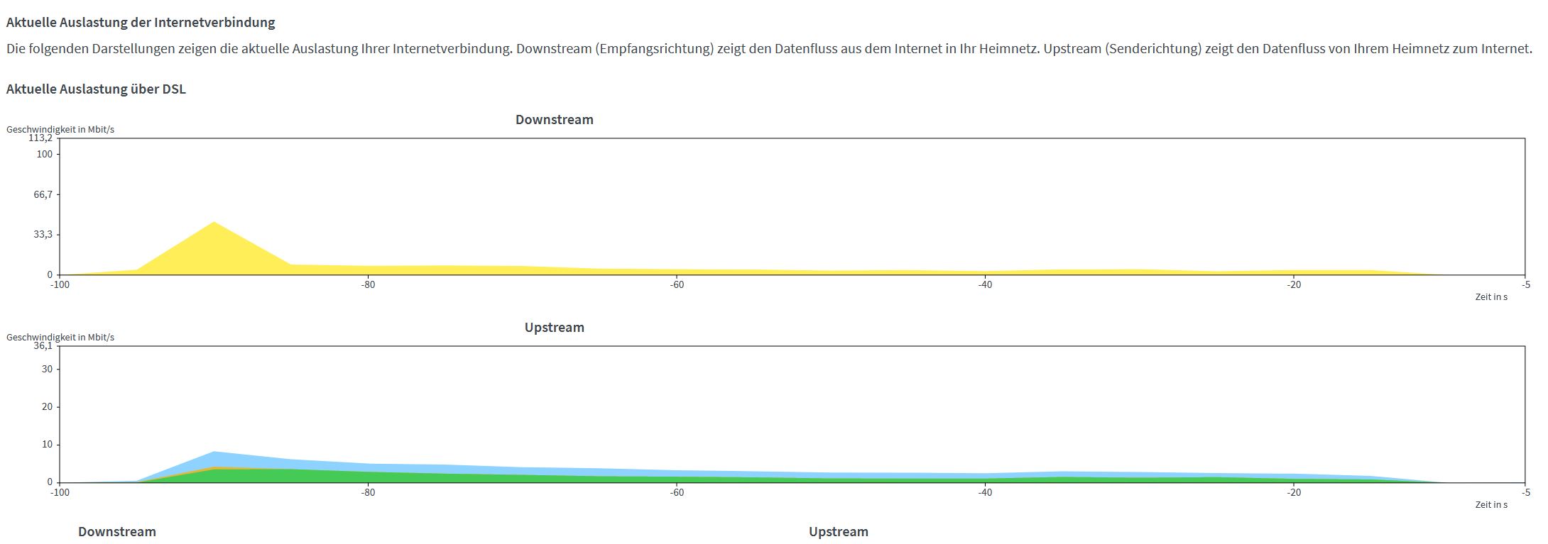 - FRITZ!Box zeigt in den Problemen des Auftretens keine Auslastung der Internetleitung, sogar eher ein komplettes Ausbleiben ebendieser (Screenshot).
