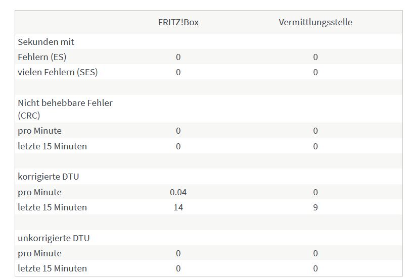 - Fehler im Reiter der FRITZ!Box sind quasi immer auf 0 bei der Vermittlungsstelle und meistens auf 0 bei der FRITZ!Box. Das Beispiel im Screenshot ist schon vergleichsweise hoch, aber wenn ich so google und sehe, bei welchen Fehlerzahlen Leute keine Probleme haben, müsste das voll okay sein.