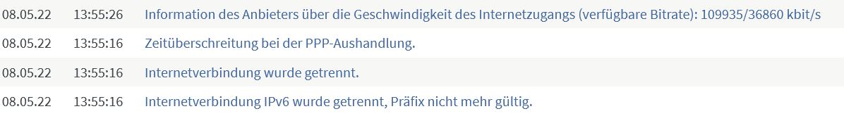 - Ereignisprotokoll FRITZ!Box zeigt Verbindungsabbrüche. Laut Telekom-Support ist die Leitung aber stabil.