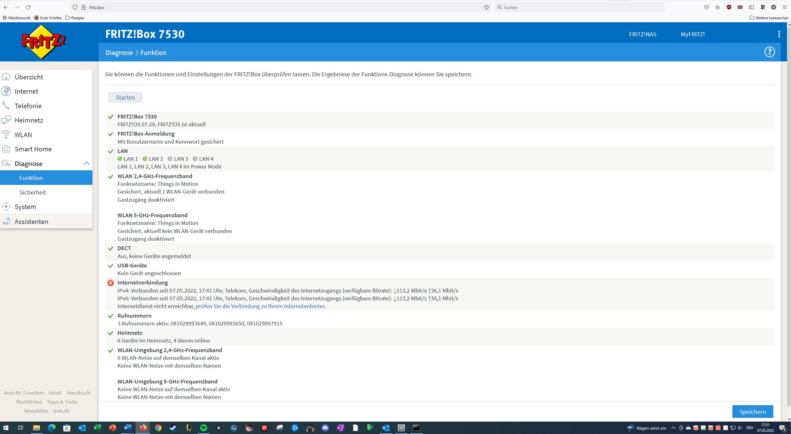 - FRITZ!Box zeigt gemäß Diagnose meist keine Probleme an der Internetleitung an und auch keinen Verbindungsabbruch. Einmal konnte ich das schnappen (Screenshot der FRITZ!Box-Dianose).