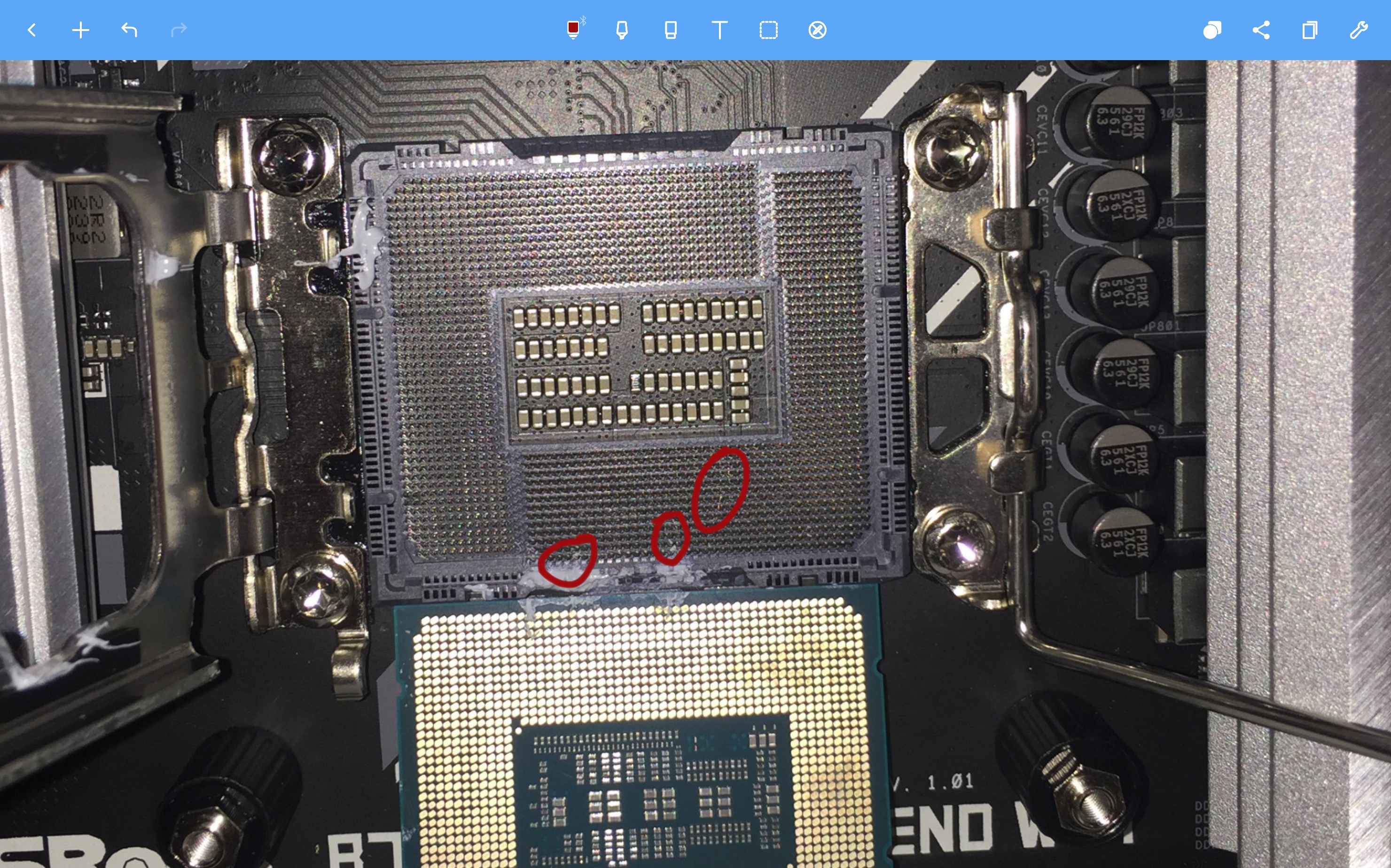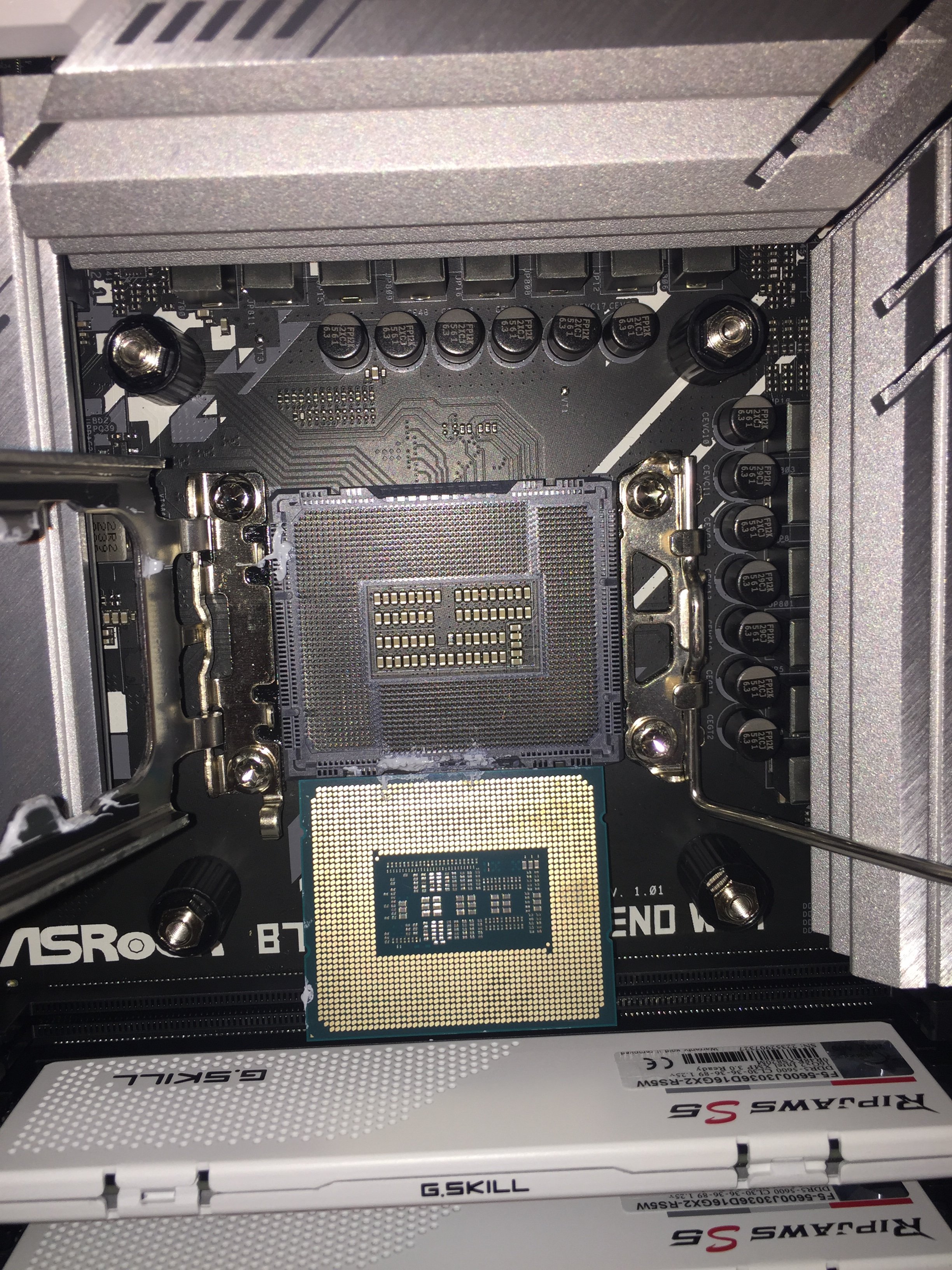 Das schlimmere ist allerdings, dass mir beim versuch die wärmeleitpaste zu entfernen ein paar fäden davon unter der CPU und in den Slot des Mainboards kamen. Diese sind stand jetzt unmöglich wieder rauszubekommen. Dümmstmöglich habe ich auch noch mit dem Alkoholtuch leicht reingewischt und kann nicht sagen, ob das feine Drahtgeflecht dabei in Mitleidenschaft gezogen wurde. Normal einsetzen ließ sich der Cpu jedenfalls wieder und der Riegel schließen