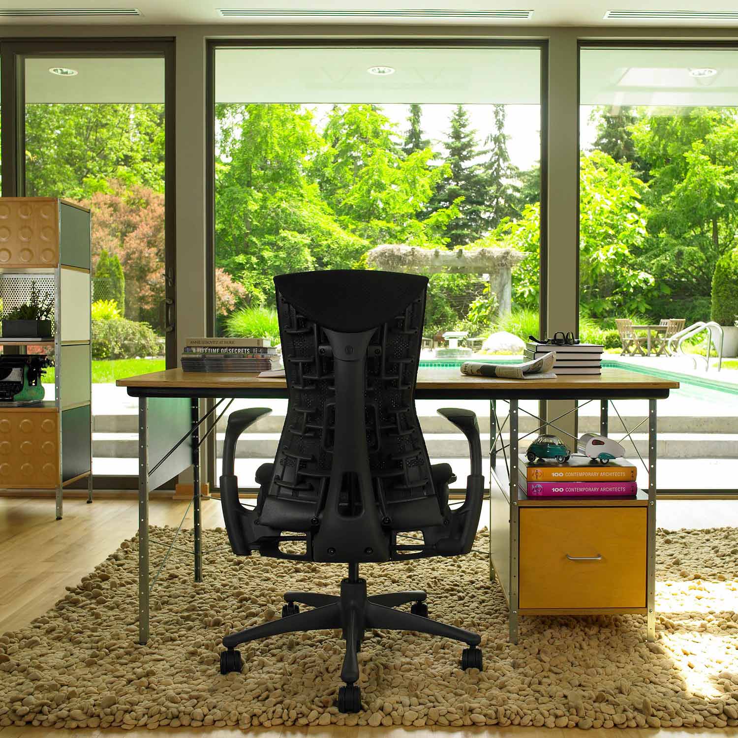 Die Rückenlehne des Embody ist im Vergleich mit anderen Stühlen relativ schmal, und, wie die Sitzfläche, nicht klassisch gepolstert. Stattdessen besteht sie aus einer Skelettartigen Kunststoffstruktur, die sehr flexibel auf Bewegungen reagiert. Gehalten wird die Skelettstruktur von einer widerrum sehr stabilen Mittelsäule, die ebenfalls aus Kunststoff besteht. Die Rückenlehne ist, wie man es bei einem ergonomischen Stuhl erwartet, der menschlichen Wirbelsäule nachempfunden.