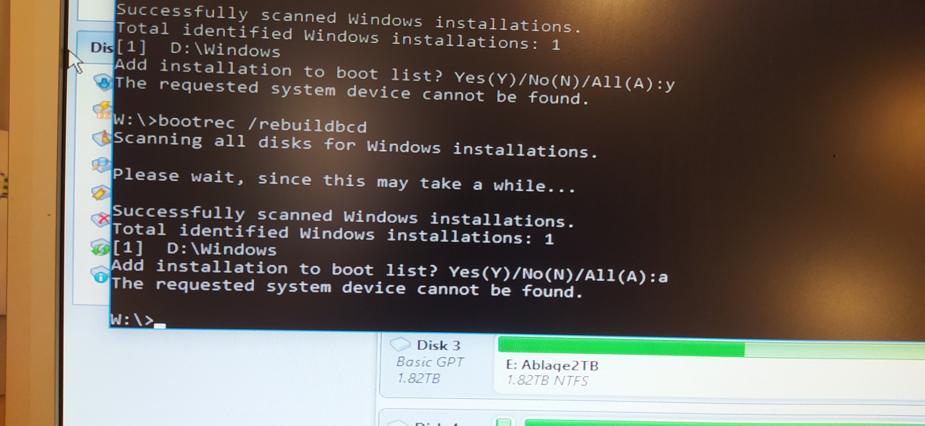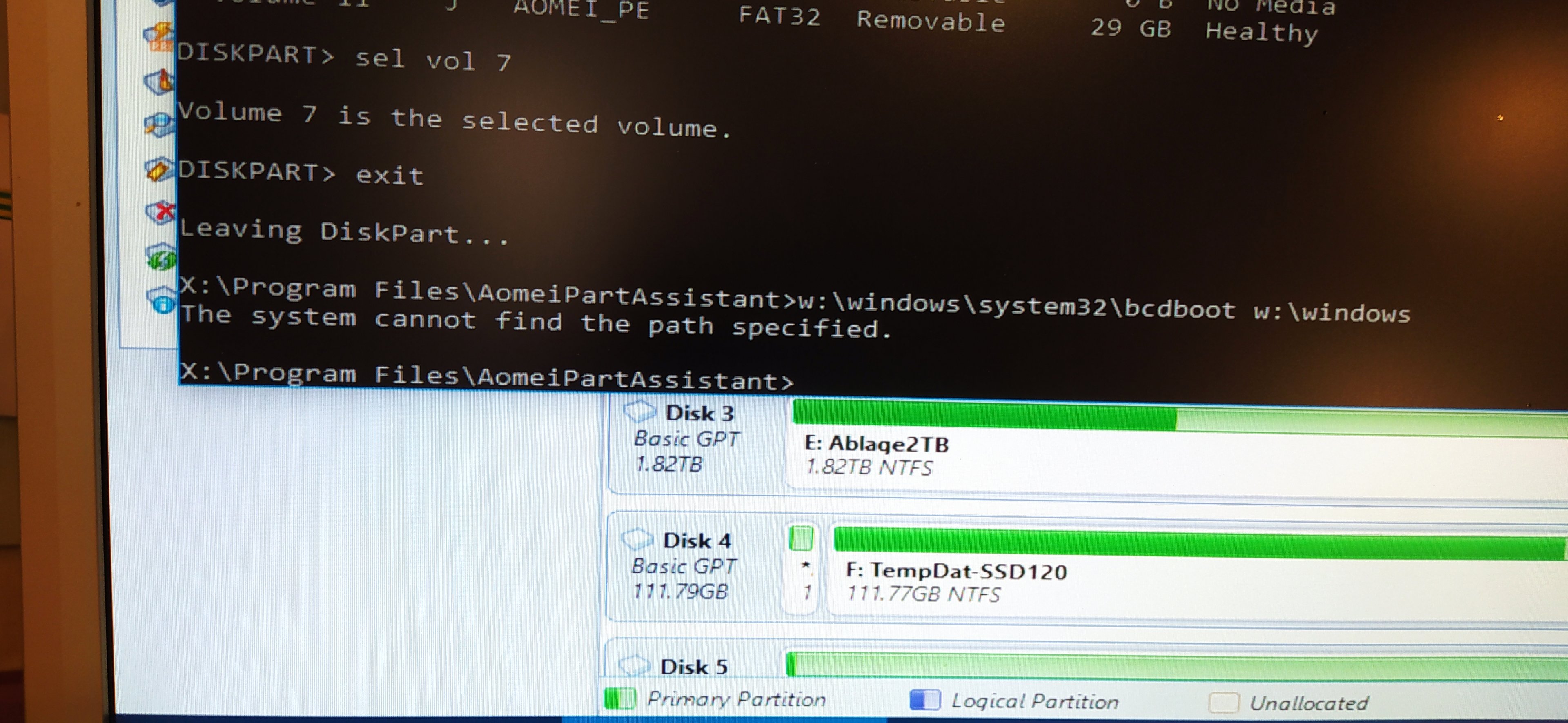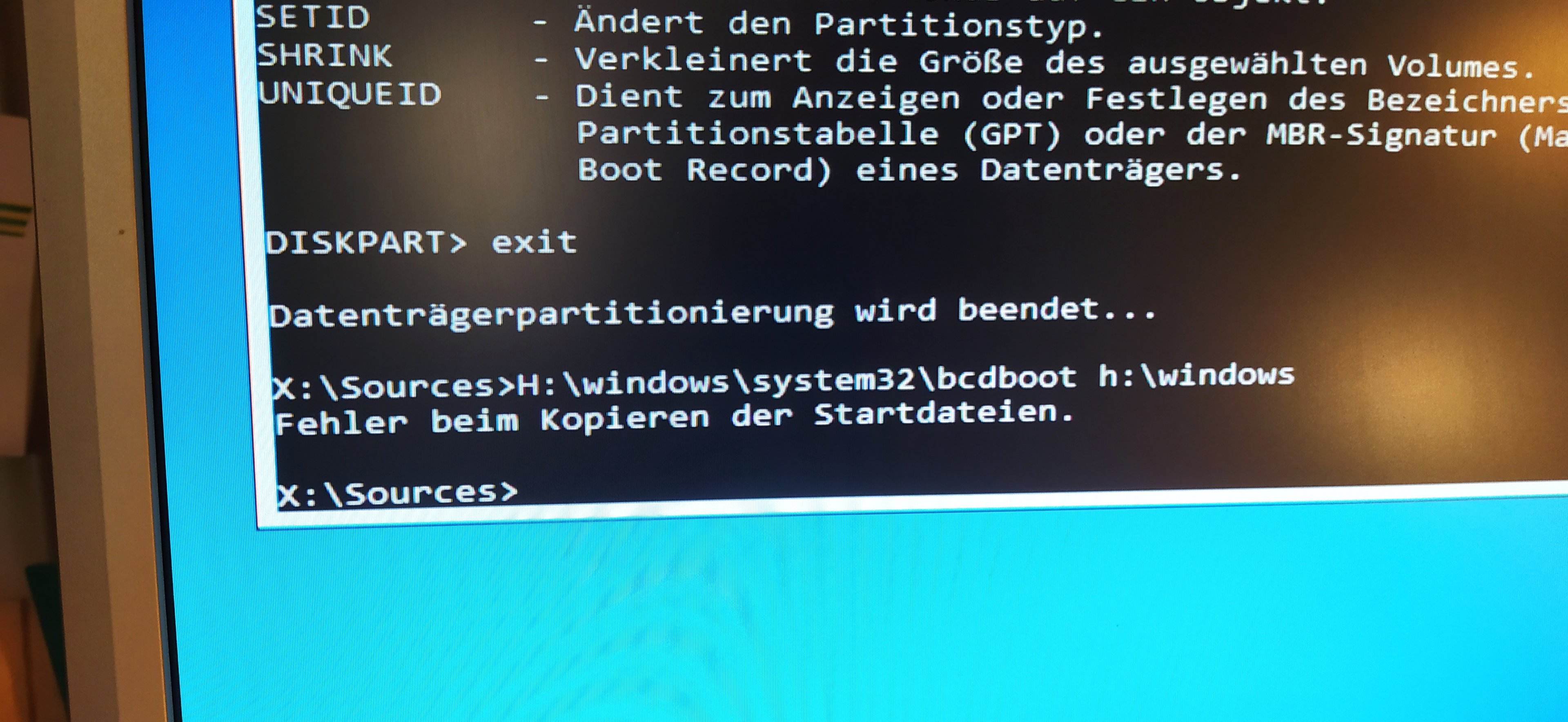 Habe im übrigen mehrere Versuche hinter mir mit wechselnden Laufwerkbuchstaben etc., bcdboot bricht letzlich immer ab