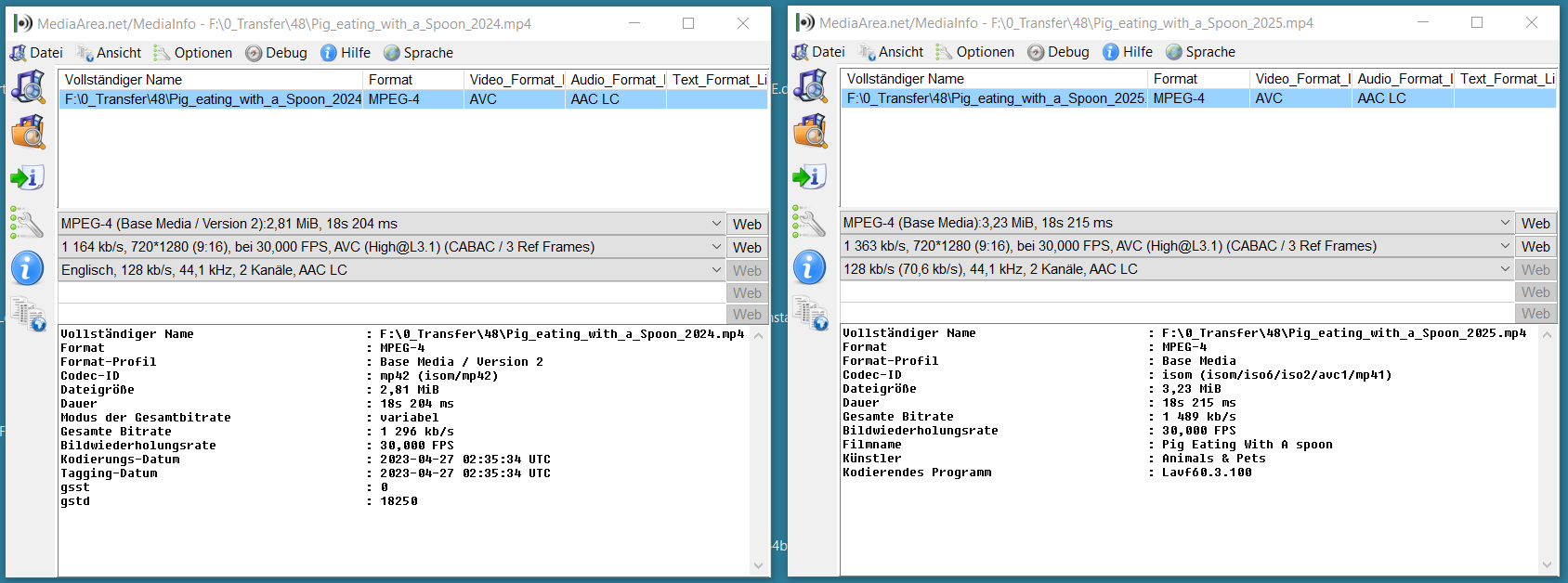 Wenn ich aus beiden Dateien (Video_2024.mp4 und Video_2025.mp4) den Codec auslese, kann ich keine Änderung erkennen; sie erscheinen mir identisch: