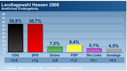 Ich will mich jetzt hier auch nicht streiten, ob das nun weine "Abwahl", eine Klatsche oder ein Verlust der Mehrheit war, Fakt ist doch, dass die CDU und damit Koch mehr als deutlich an Stimmen eingebüßt hat. Es ist im Endeffekt reine Wortklauberei. Letztendlich meinen wir beide dasselbe, insofern sehe ich hier keinen Streitpunkt.