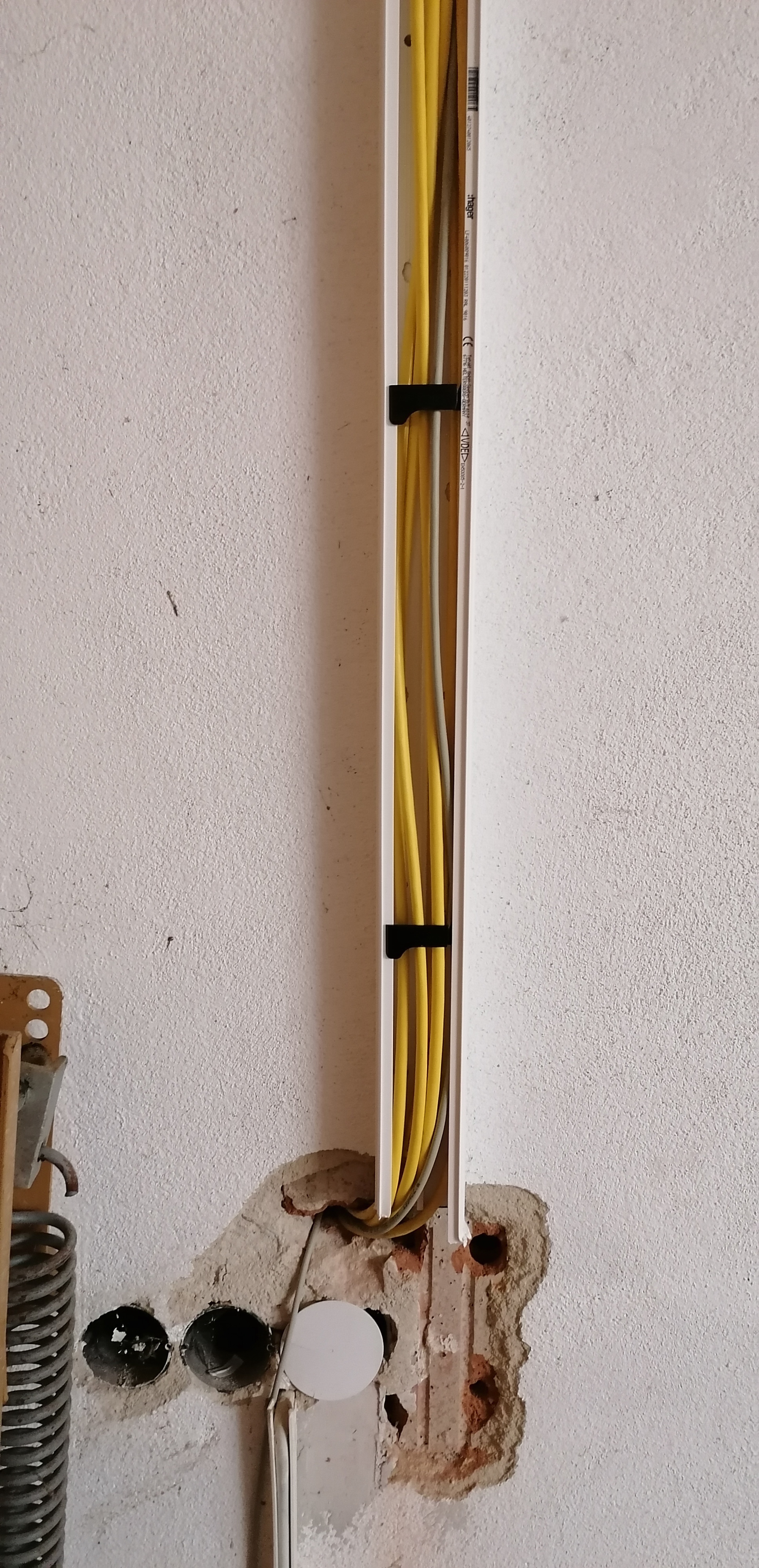Also sprach ich den Elektriker an, ob er nicht diese viel zu langen Cat7-Leitungen, die ja so lang waren, dass sie im Kabelkanal schon deutlich geknickt waren (siehe Ursprungspost), nicht einfach vollends durchs Loch in der Wand schieben könnte, sodass im Kabelkanal durch den Überlauf kein Knick mehr entsteht.