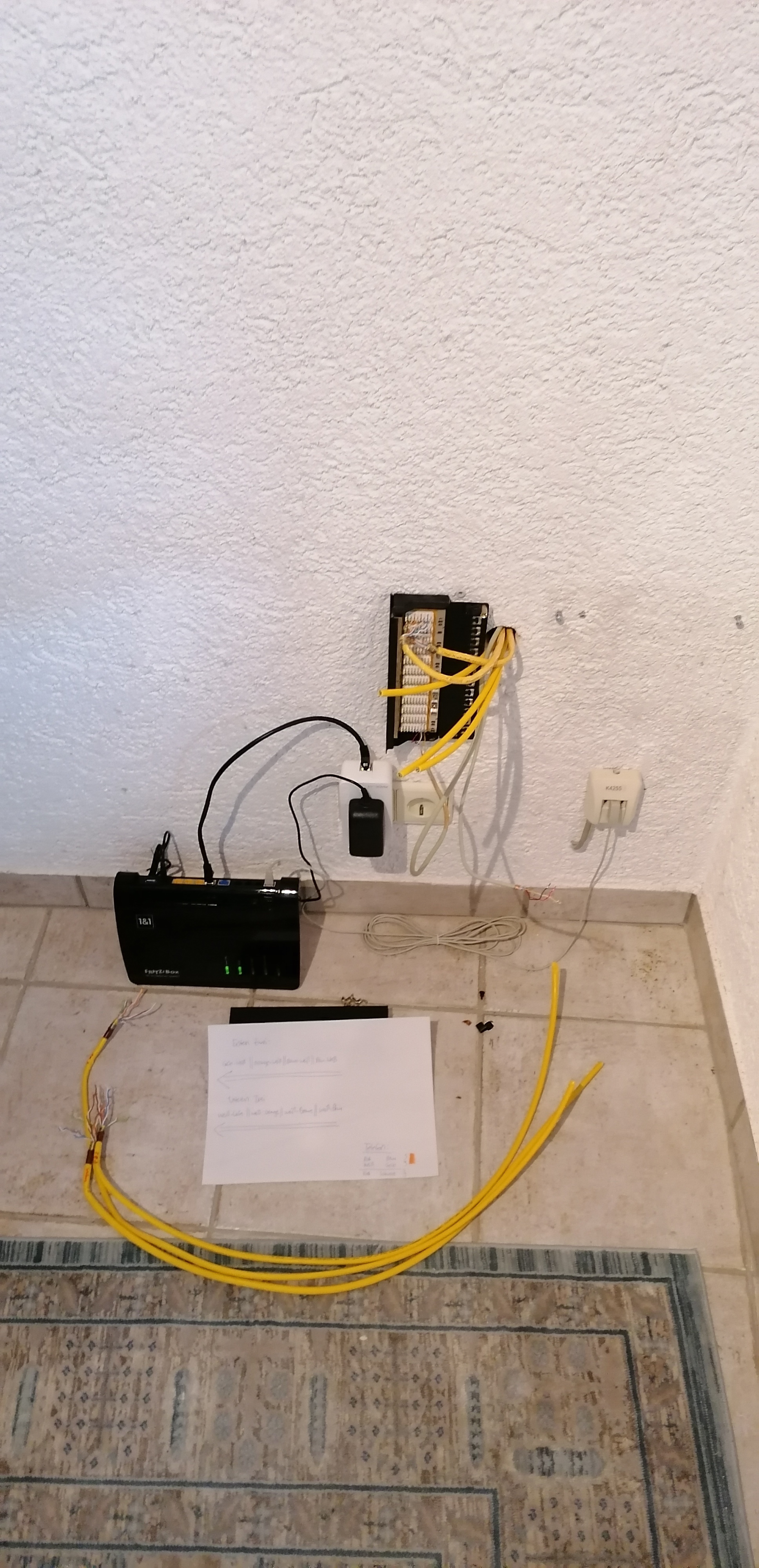 Begeistert war er nicht, weil er ja eigentlich für die Solaranlage gerufen wurde. Deswegen hab ich das Ganze einfach selber in die Hand genommen: habe die Kabel vom DeleyCon-Patchfeld rausgerissen (also die Adern aus den Klemmen), die Kabel durch die Wand gezogen, sodass im Kabelkanal kein Überstand mehr war und glücklicherweise sind die Kabel so lang gewesen, dass der Kabelknick vom Kabelschacht auch durch die Wand durch rutschte und so hab ich die Kabel jetzt einfach direkt hinter der Knickstelle abgeschnitten.