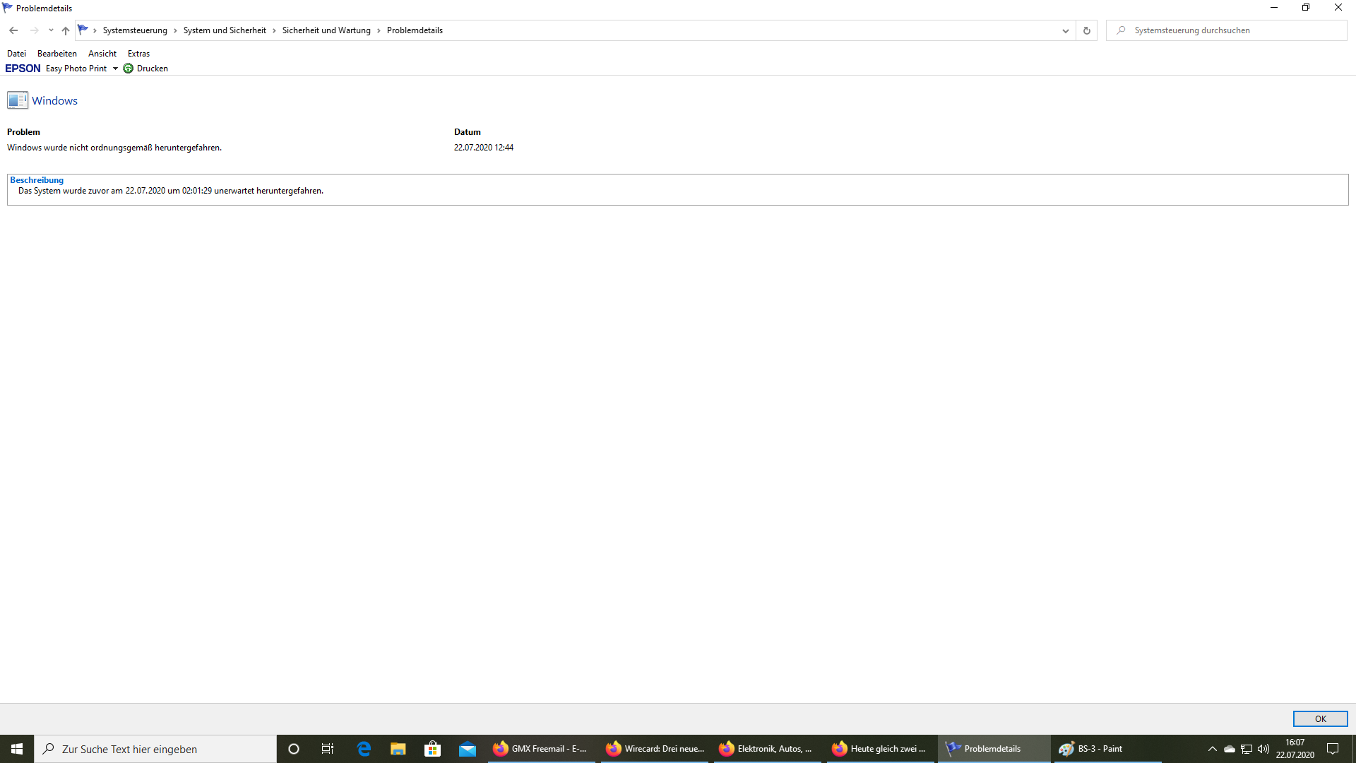 Das erste Mal passierte es heute, als ich u. a. ein YouTube-Video offen hatte; vorhin das zweite Mal, als ich den Rechner aus dem Energiesparmodus wieder zurückholen wollte.