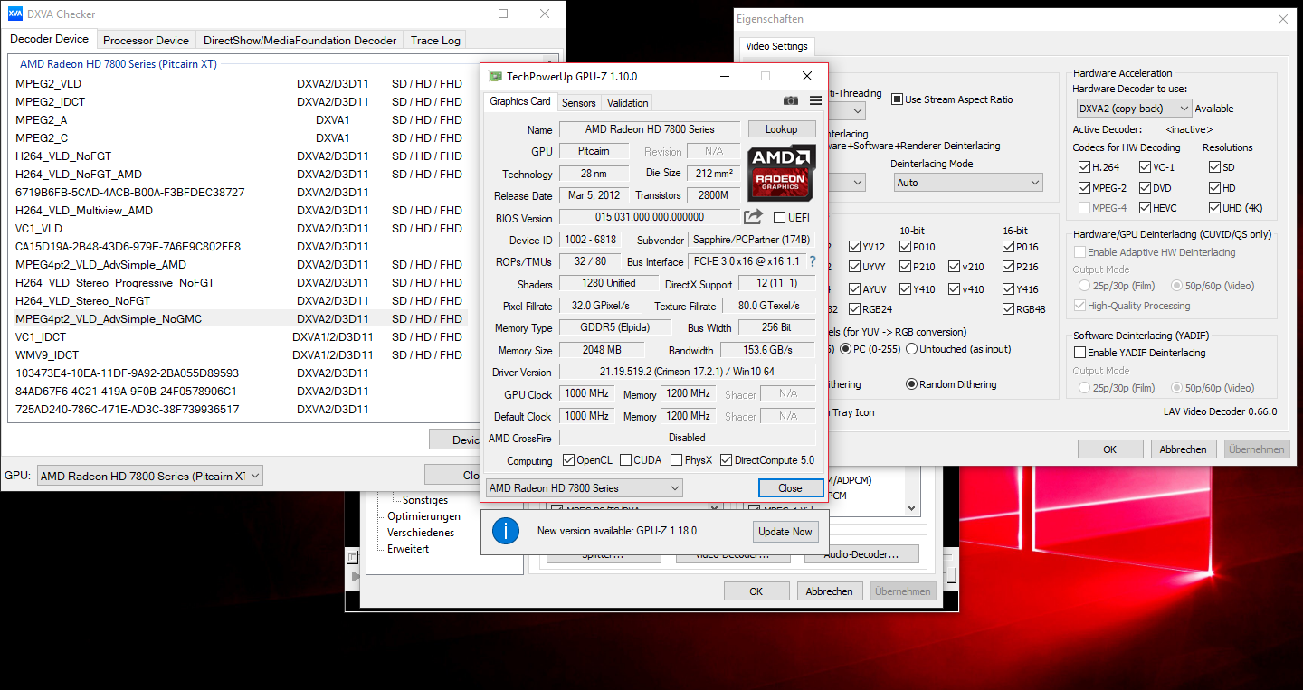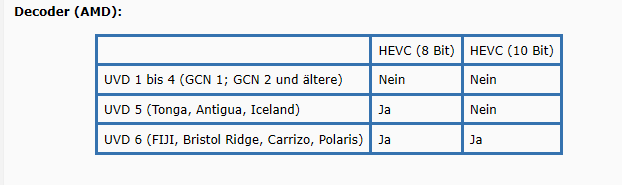 Leider reicht ein verbauter Decoder nicht immer aus, auch die Software muss ihn nutzen können. Neben den Treibern (die möglichst aktuell sein sollten), spielt auch der Player eine Rolle. Ein Beispiel aus der Vergangenheit: AMDs Fiji (Radeon R9 Fury) konnte mit dem MPC-HC und dem internen LAV Video Decoder 0.65.0.9 den vorhanden Decoder nicht nutzen. Erst mit Version 0.66 war dies möglich. Apropos MPC: Schaut mal unter Optionen --> Interne Filter --> Video Decoder …
