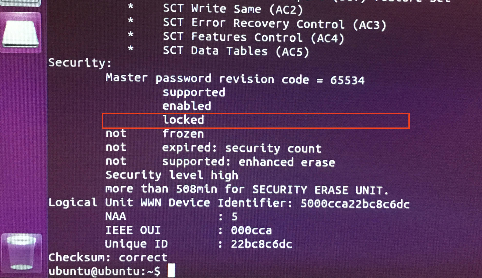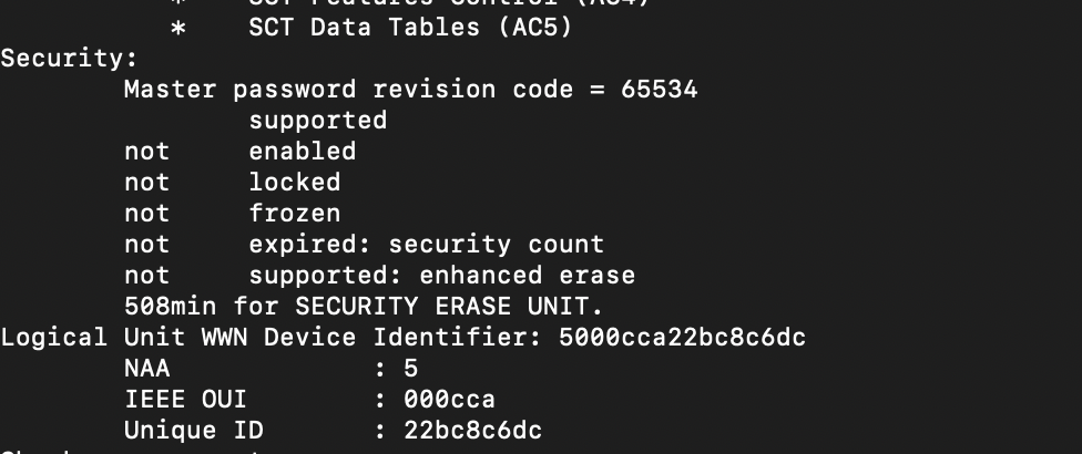 Da seine HDD nach dem Secure Erase nicht mehr funktioniert (SMART-Werte alle noch i.O aber kein Zugriff auf die HDD möglich) habe ich die HDD bei mir mal mittels hdparm -I geprüft. Wie zu erwarten steht die HDD als "locked" da.