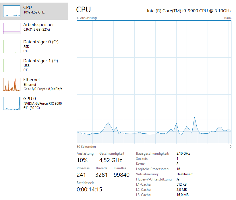 Laut Task-Manager liegt die Arbeitsspeicherauslastung bei rund 20 % und die CPU bei 21-22 %, wenn Steam was downloaded.