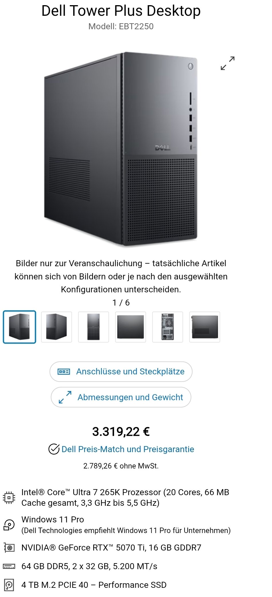 Wir suchen für unsere Marketing-Abteilung einen hochperformanten Desktop-PC. EInzige Vorgabe: Es muss ein Dell sein und darf keine Gaming-Marke sein (z.B. Alienware). Darin sollte entsprechend die bestmögliche Grafikkarte, das Maximum an aktuellem RAM und eine schnelle SSD-Festplatte verbaut sein.