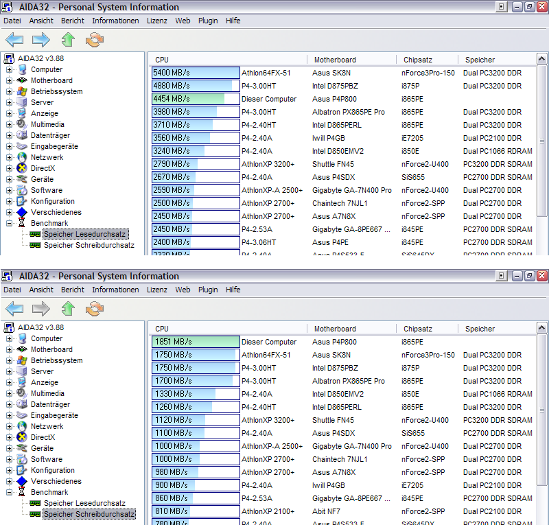 also im single schafft meine gurke 2,6gb/s und das bei 166fsb. naja..da dasboard aber zur rep. ist und ich momentan nen k7s5a mit 266er chip am laufen habe komm ich auf 137fsb (mit honeyXbios) und auf 1,8gb/s ... das klingt zwar recht wenig, aber die vergleichswerte schlag ich locker
