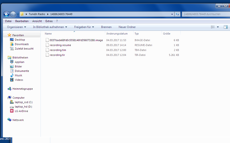 Ich habe vor 10 Jahren etwa mit Tune-in pro Radio Sendungen aufgenommen. Jetzt habe ich die Aufnahmen auf dem Handy kann sie aber selbst auf dem PC mit keiner! Software abspielen. Tune-in pro unterstützt jetzt keine Aufnahme mehr auf dem Handy und abspielen mit Tune-in pro auf dem Handy geht auch nicht weil der Menü Eintrag fehlt. Hat jemand eine Idee? Vielleicht verschlüsselt?