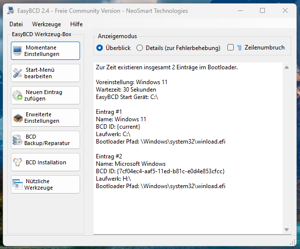 Ich bekomme auch wie früher jetzt nicht mehr DOS/CMD angezeigt für die Auswahl, sondern die blaue Windows Metro Optik, wo ich zwischen meinem Game und Office aussuchen kann, jedoch ist eines anders als früher, wenn ich statt Default Game, das Office Windows auswähle, startet der PC noch einmal neu und bootet ins Office und umgekehrt, früher hat der aus der DOS/CMD Oberfläche ohne Neustart gebootet.