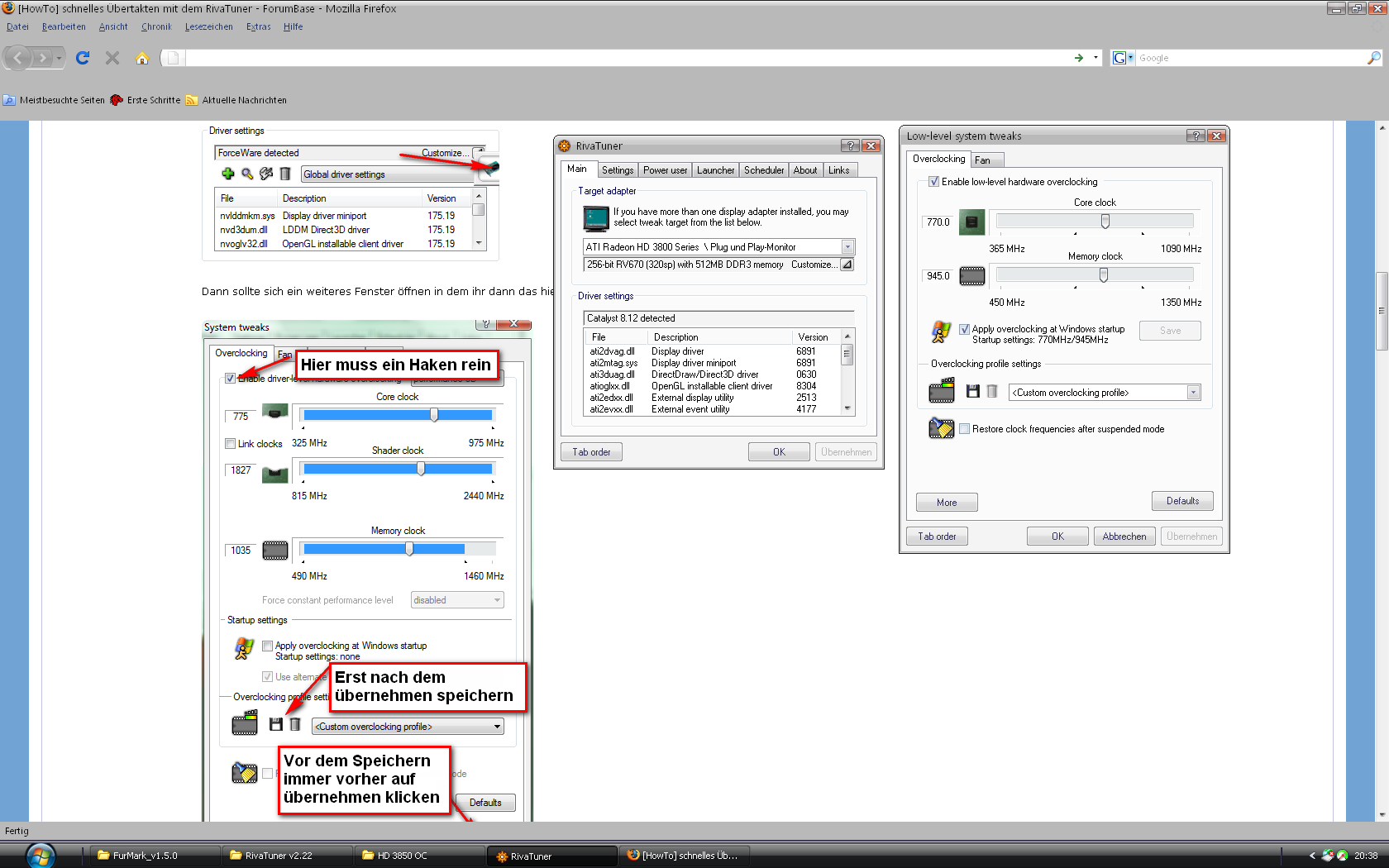 ich möchte meine Powercolor HD 3850 512 mb mit dem Rivatuner übertakten, hab auch schon How To's dazu durchgelesen. Laut des How To sollten beim Rivatuner 3 "Spalten" zum verstellen der MHz verfügbar sein ich hab allerdings nur 2. Vllt kann mir jemand sagen wo ich etwas umstellen muss ect.
