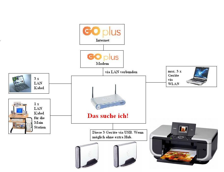 Auf jedenfall suche ich erstmal einen Router, dieser sollte alles können was auf der Skizze beschrieben ist. Wichtig ist das er WLAN Standard N draft unterstützt und auch mind. 1-2 Festplatten + einen Drucker unterstützt damit alle PCs darauf zugreifen können. Kann man zur not ein USB hub verwenden wenn der nur einen USB Port hat? Oder brauche ich dazu ein NAS (??? kein plan was das ist, mein kumpel meinte sowas brauch man)?