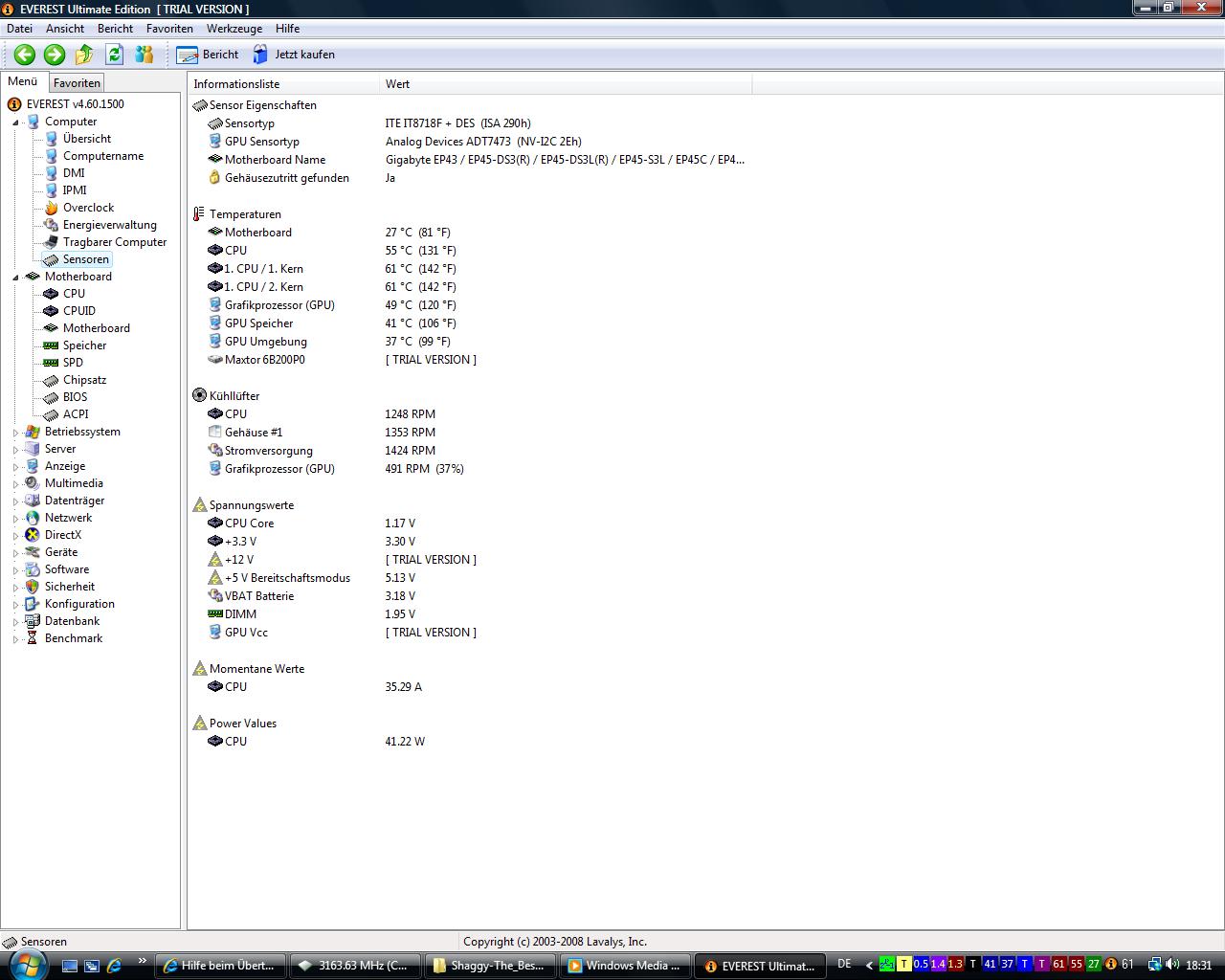 Aber sobald ich jetzt den FSB von 314Mhz auf nur 316 stelle dann hat der auf einmal unter Vollast ca 60°? nur wegen 2Mhz FSB kann der doch nicht 7° wärmer werden...ich glaube so langsam das ich eher einen schlechten CPU erwischt habe...kann das sein? oder evtl Problem mit dem Gigabyte P45 DS3...neustes Bios habe ich drauf 8F ist das soweit ich weiß.....ich lass es jetzt mal so ich hab alles versucht und komme nicht weiter.