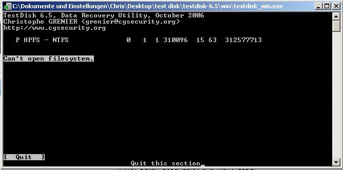 Die Partition ist also da. (2.jpg) Wenn ich versuche, die Dateien anzeigen zu lassen, steht dort nur "Can't Open filesystem". (3.jpg)