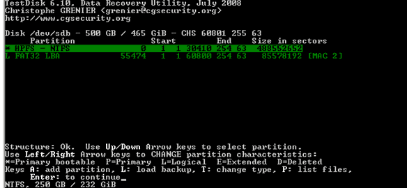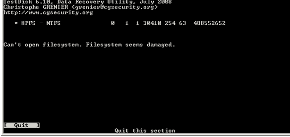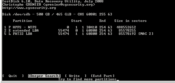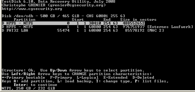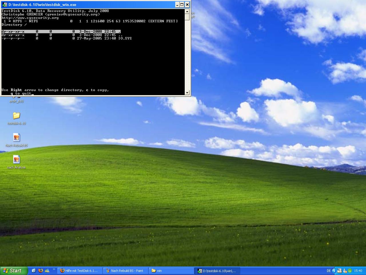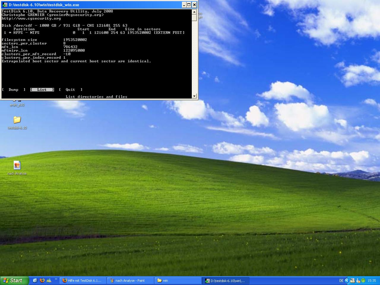Hab dann hier das Forum durchgeforstet und bin auf das Prog TestDisk gestossen. So weit so gut. Allerdings kann ich mit den Informationen, die mir das Prog gibt, nicht sehr viel anfangen. Ich poste mal hier ein paar Screenshots von der Analyse, in der Hoffnung, daß jemand was damit anfangen kann.