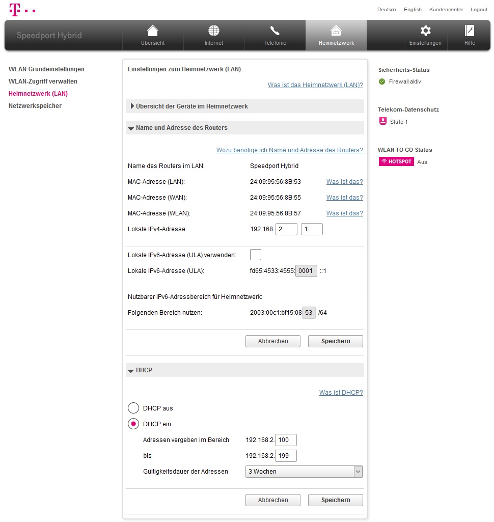 1. An der ersten TAE hängt mein Telekom Speedport Hybrid (Das WLAN ist hier aus da Reichweite und Geschwindigkeit mies sind)