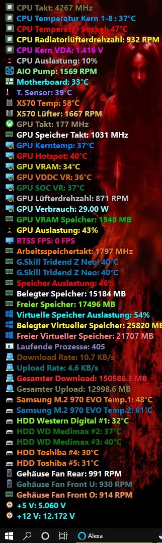 bl3d2death schrieb:Ich gebe auch mal meinen Senf dazu. Ich habe mir ein neues System auf Basis eines Ryzen 7 3800XT gebaut. Das Ganze steckt auf einem MikroATX in einem kleinen Midi Tower und steht im Wohnzimmer. Die Luftverteilung ist eigentlich ganz gut meine ich. Vorne ein 15-20 cm (genaue Größe weiß ich nicht) Lüfter der auf 600 RPM arbeitet und unter Volllast auf ca 730 gut hörbare RPM hoch dreht. Oben ist ein Gitter durch das die Abluft abziehen kann. und nach hinten zur Öffnung des Rücklüfters sitzt ein für das Gehäuse schon überdimensionierter Alpenföhn Brocken, mit massivem Kühlkörper und 2 Lüftern, die bis 50 Grad auch auf ca 600 RPM drehen und bis 70 Grad dann auf 100% (vllt so 800 RPM) hochdrehen. Das Netzteil ist getrennt und saugt unten an und bläst hinten raus.