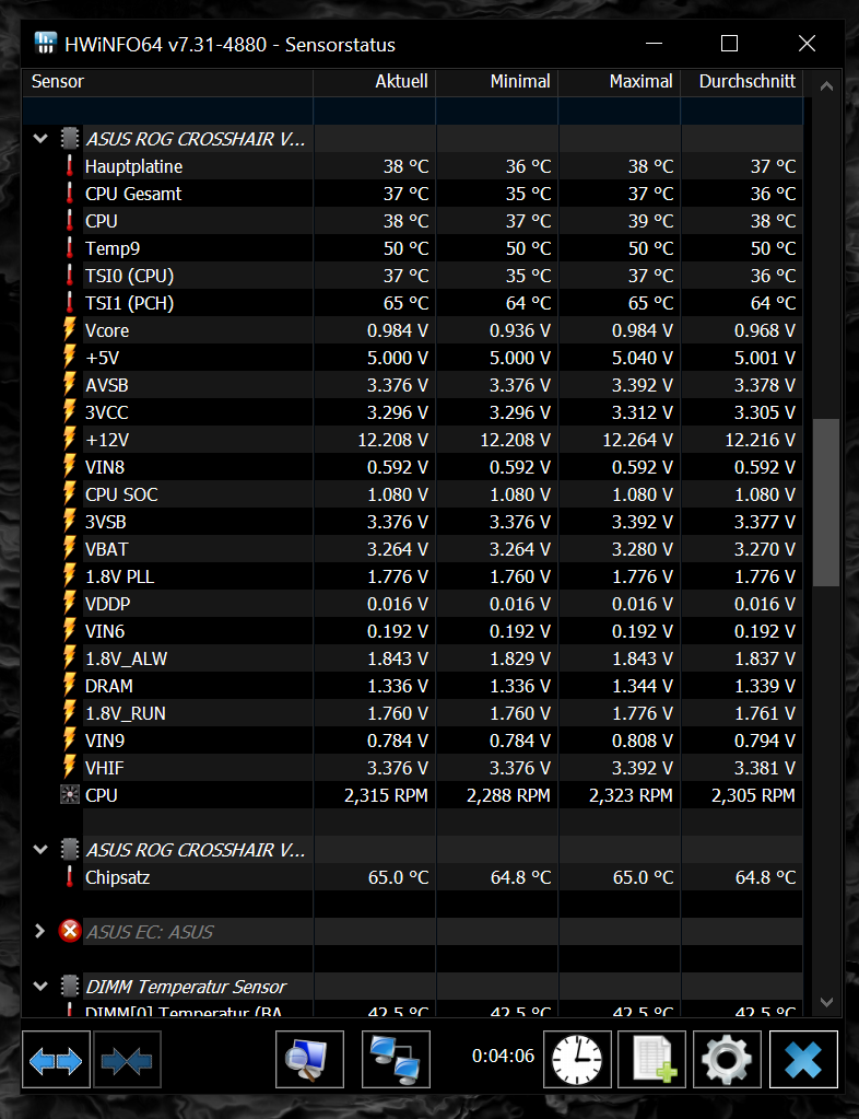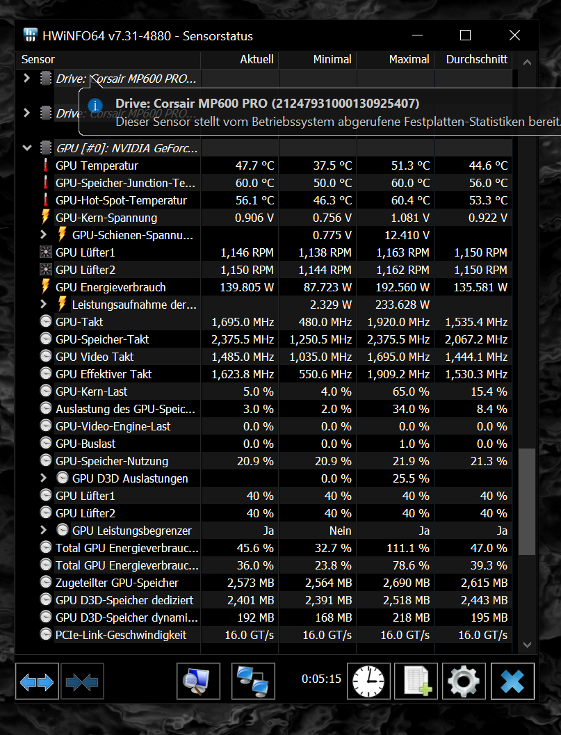 Was mich nur wundert, ist das Heute als der Fehler sich ankündigte, ich noch schnell Fotos von HWINFO und MSI Afterburner machen konnte (siehe Anhang). Was mir direkt auffiel, waren Watt und Spannung der CPU (siehe anhang). Der hohe verbrauch der CPU war auch nicht kurzzeitig von ein Paar Sekunden sondern hat schwankend (130W - 261W), bis zum Herunterfahren des PC angehalten. Da ich jetzt kein Experte bin weis ich nicht ob das ''normal'' ist.