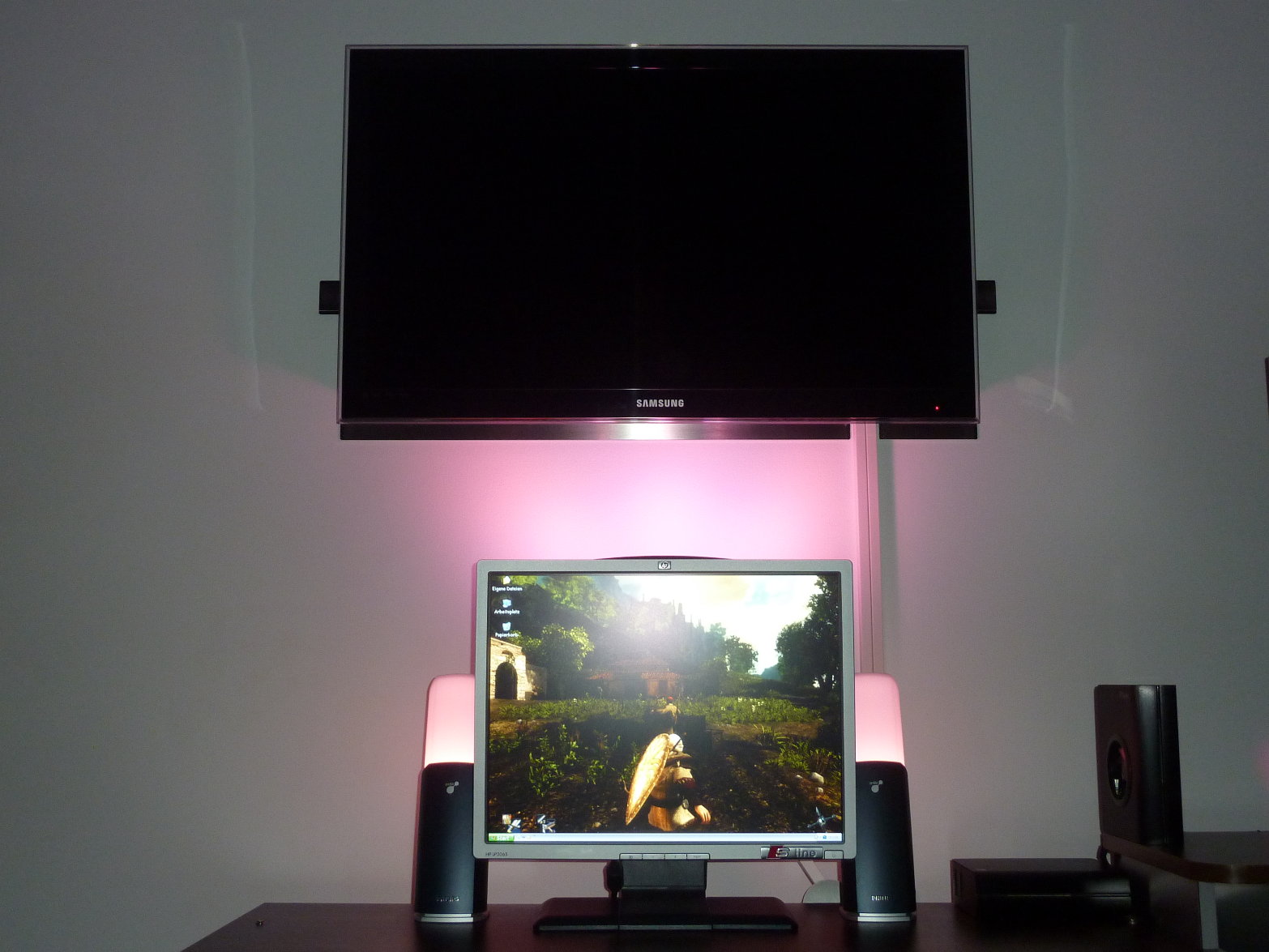 da ich gestern mal einen freien Tag hatte, wollte ich mal ein wenig basteln und bin auf die Idee gekommen eine kleine Hintergrundbeleuchtung für meinen Monitor zu bauen. Eigentlich kann man das nicht Modding nennen, das es ziemlich simpel ist, aber wie ich finde sehr nett anzusehen. Dazu habe ich einfach 2 alte blaue Kaltlichkathoden verwendet, die über ein Ansteuerungsmodul an der Steckdose angeschlossen werden. Also einfach ein 12V Netzteil an die Steuerung gelötet, diese gibt die 12V weiter an die Kathoden. Dazu gibt es noch 4 verschiedene Modi zur Beleuchtung: Blinken, Pulsieren, passend zur Musik und normal Ein. Man kann noch 2 weitere Kathoden dort anschließen. Jetzt aber erstmal ein paar Bilder: