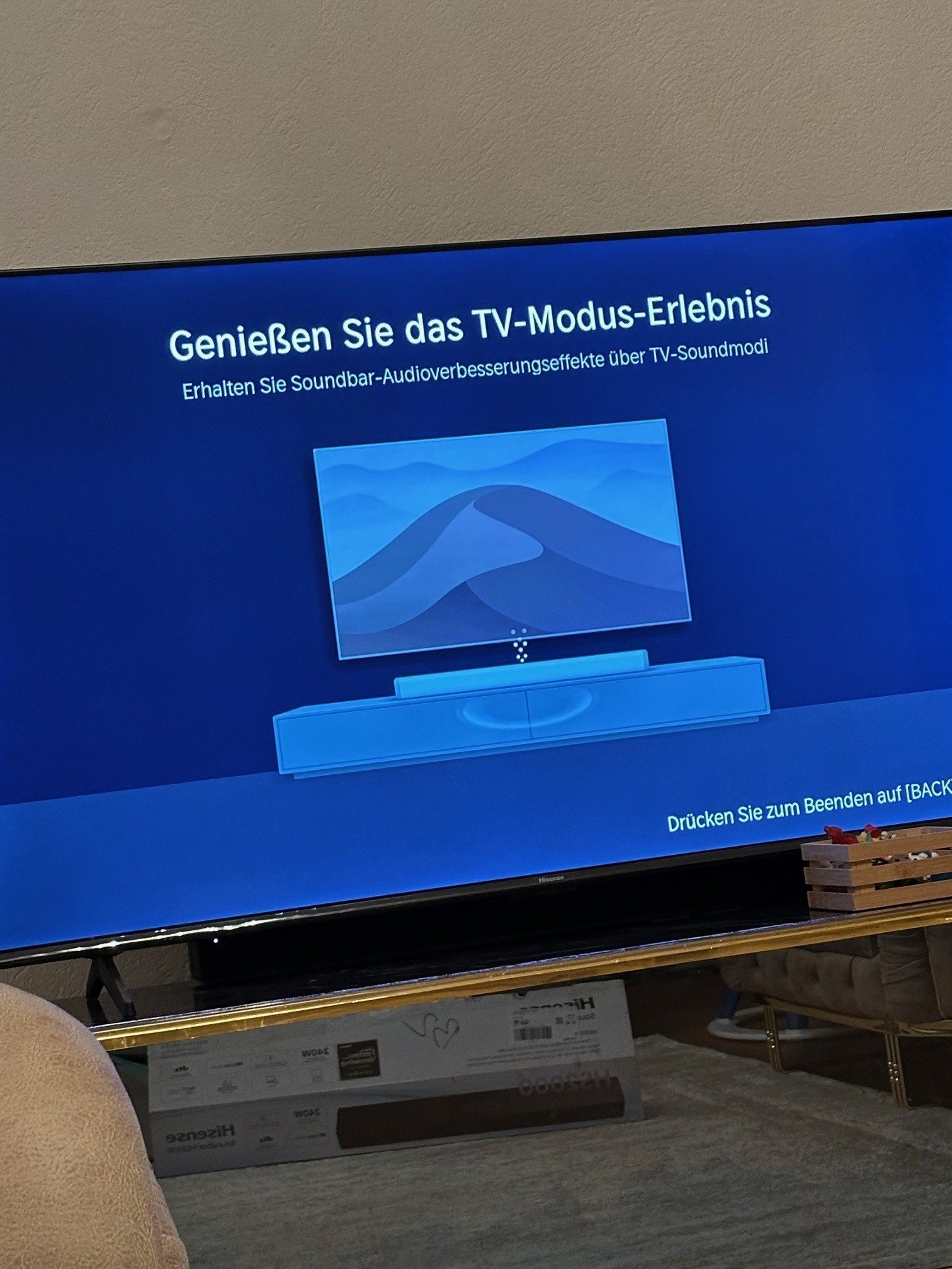 Ich vermute stark, dass der Fernseher erkennt, dass es eine Hisense Soundbar ist und mir die tollen Features zeigen will nur will ich dieses Popup nicht sehen - es taucht aber bei JEDEM Einschalten auf. Ich habe diverse Einstellungen probiert und das Internet durchforstet aber nichts klappt. Zuletzt habe ich am TV die Einstellung deaktiviert, dass dieser die Soundbar nicht ausschalten soll, wenn ich den TV ausschalte nur nach 15min springt die Soundbar in den Standby Modus und wenn ich danach alles wieder einschalte, kommt dieses nervige Fenster erneut. Drehe echt durch deswegen^^
